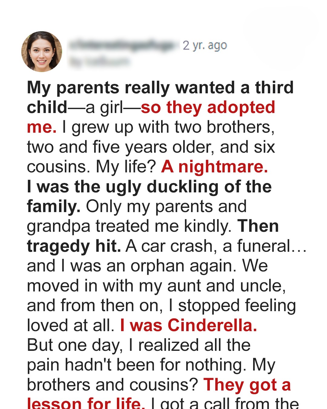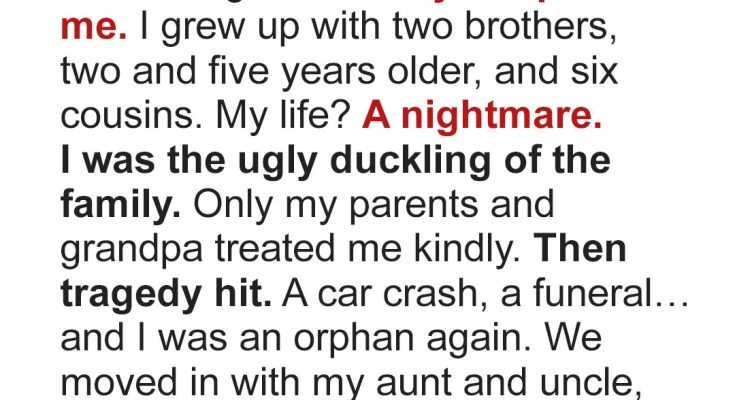 My parents always dreamed of having a daughter. After having two boys, they decided to adopt. That’s where I came in. I was welcomed into the family with open arms, or so I thought. Growing up with two older brothers, who were two and five years older than me, and six cousins, was chaotic. I always felt like the odd one out, the ugly duckling in a family of swans. Only my parents and my grandpa seemed to genuinely care for me. Then, tragedy struck. A devastating car crash took my parents away from me. One moment, I had a family, and the next, I was an orphan again. The funeral was a blur of tears and whispered condolences. I felt completely lost and alone in the world. It was as if the ground had been swept from under my feet, leaving me suspended in a void of grief and uncertainty. I didn’t know where to turn or what to do. Everything I had known and loved was gone in an instant. After the funeral, my brothers and I moved in with my aunt and uncle. The house was already crowded with their own children, my cousins, so I felt like an unwanted guest from day one. My aunt and uncle weren’t unkind, but they certainly weren’t warm or affectionate. From that moment on, I stopped feeling loved at all. I was treated more like a burden than a member of the family. I was essentially Cinderella, doing all the chores while my cousins went out and had fun.