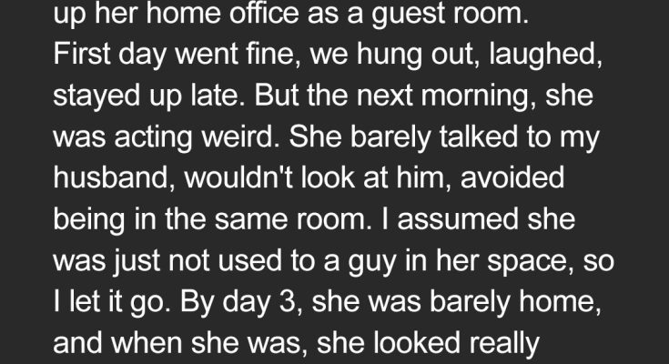 My husband, Mark, and I decided to take a much-needed vacation. We booked flights to visit my sister, Sarah, who lived across the country in a bustling city. Sarah was thrilled when we told her we were coming. She gushed about how excited she was to see us and even rearranged her home office into a comfortable guest room for our stay. We were looking forward to a relaxing week of sightseeing, good food, and quality time with family. The first day went smoothly. We arrived, Sarah greeted us with open arms, and we spent the afternoon catching up. We laughed, shared stories, and reminisced about our childhood. Mark seemed to be getting along well with Sarah, and the atmosphere was light and cheerful. We ordered takeout for dinner, stayed up late chatting, and eventually retired to our respective rooms. However, the next morning, I noticed a shift in Sarah’s demeanor. She was acting strangely, barely acknowledging Mark’s presence. She avoided eye contact, seemed tense, and made excuses to leave the room whenever he entered. I initially brushed it off, assuming she was simply not used to having a man in her space. I figured she would relax and get comfortable as the days went on. But her behavior only intensified.