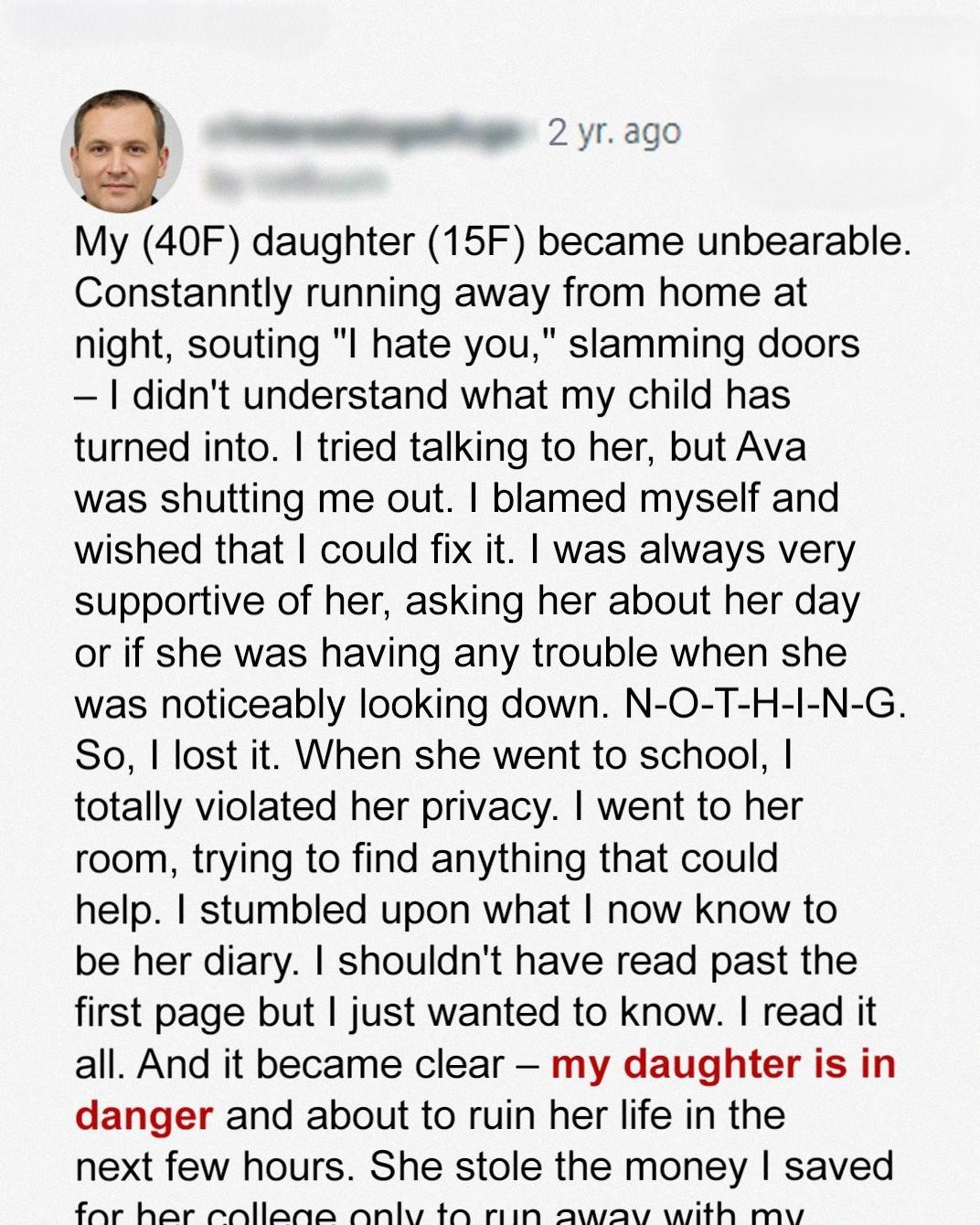 As I turned the pages, a horrifying picture began to emerge. My daughter was in **grave danger**, poised to make a decision that would irrevocably alter the course of her life. She had stolen the money I had painstakingly saved for her college education, and she was planning to run away with someone. Someone I knew. Someone I trusted. Someone who was supposed to protect her.