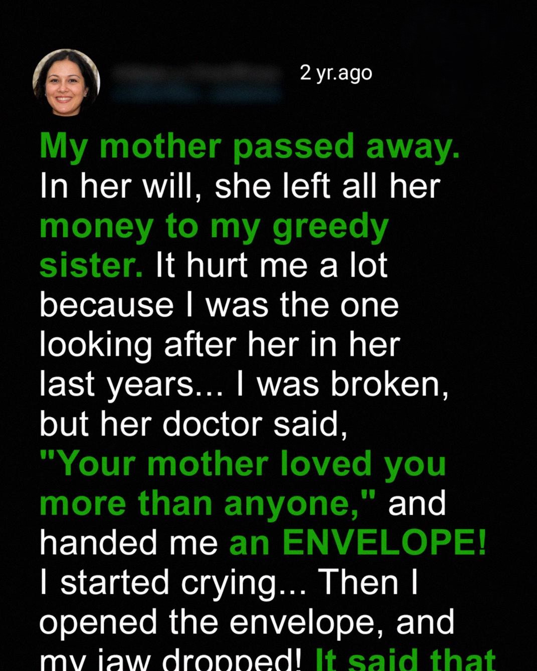 With trembling hands, I tore open the envelope and unfolded the letter inside. As I began to read, my eyes widened in disbelief. It turned out my mother knew my sister only cared about money. The letter explained that she left everything to my sister under one condition: that my sister could only get the money if she was **able to run my mother’s business for three years**. If she failed to do so, all the assets of the business would be transferred to me. It turns out my sister did not care about the business, she quickly mismanaged it, and now the business belongs to me.