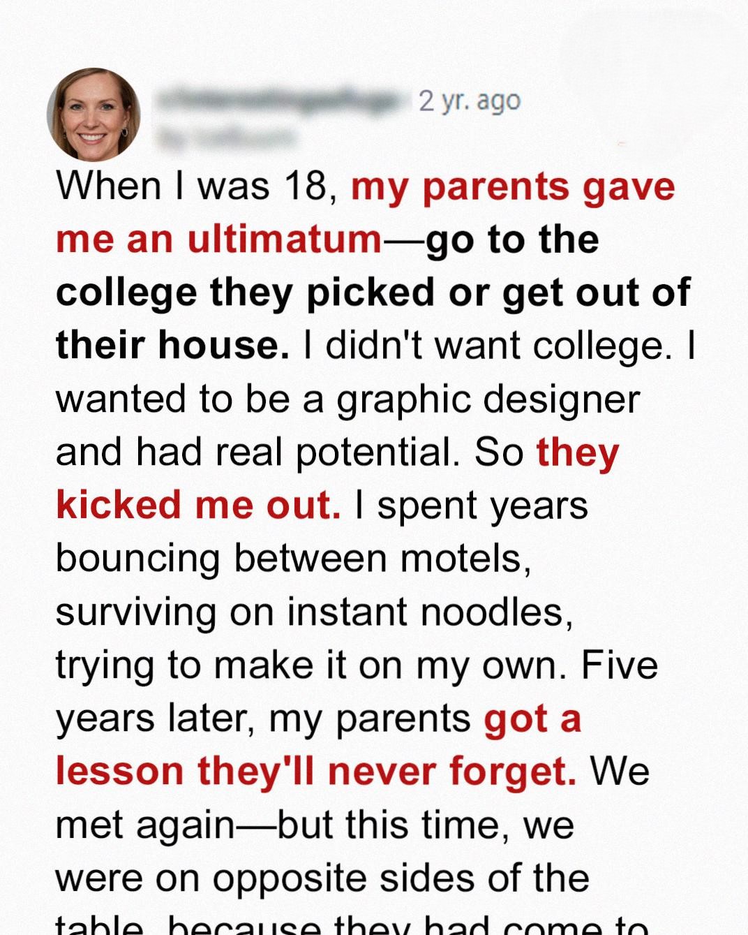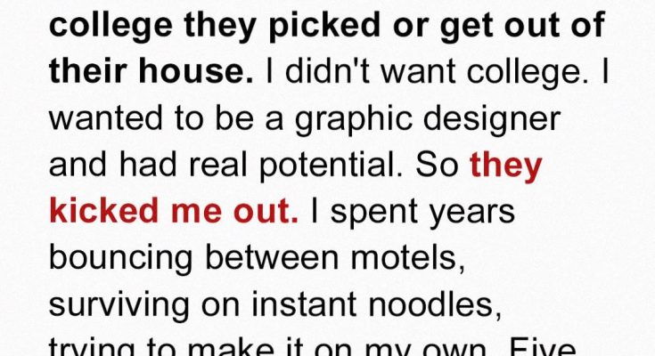 Life has a funny way of turning the tables, doesn’t it? When I turned eighteen, I had dreams – big, vibrant dreams of becoming a graphic designer. I poured my heart and soul into my art, spending countless hours honing my skills and building a portfolio. College, to me, felt like a detour, a distraction from the path I was so eager to tread. But my parents? They had a different vision for my future. They presented me with an ultimatum: attend the university they had chosen for me, a place that offered a ‘practical’ degree in business administration, or pack my bags and leave. There was no room for discussion, no compromise to be found. They were adamant, convinced that my artistic aspirations were nothing more than a childish fantasy. Looking back, I understand their perspective, their desire to provide me with a stable and secure future. But at the time, their lack of faith in my abilities felt like a crushing blow. I felt trapped, suffocated by their expectations. So, I made a choice. A difficult, heartbreaking choice. I chose my dreams. I chose myself. I packed my meager belongings, said a tearful goodbye, and walked out the door, ready to face the world on my own terms, fueled by passion and an unwavering belief in my talent, not knowing the sheer hardship that awaited me and that would shape the course of my young life in such profound ways. Little did they know, or I for that matter, what fate had in store for us all.