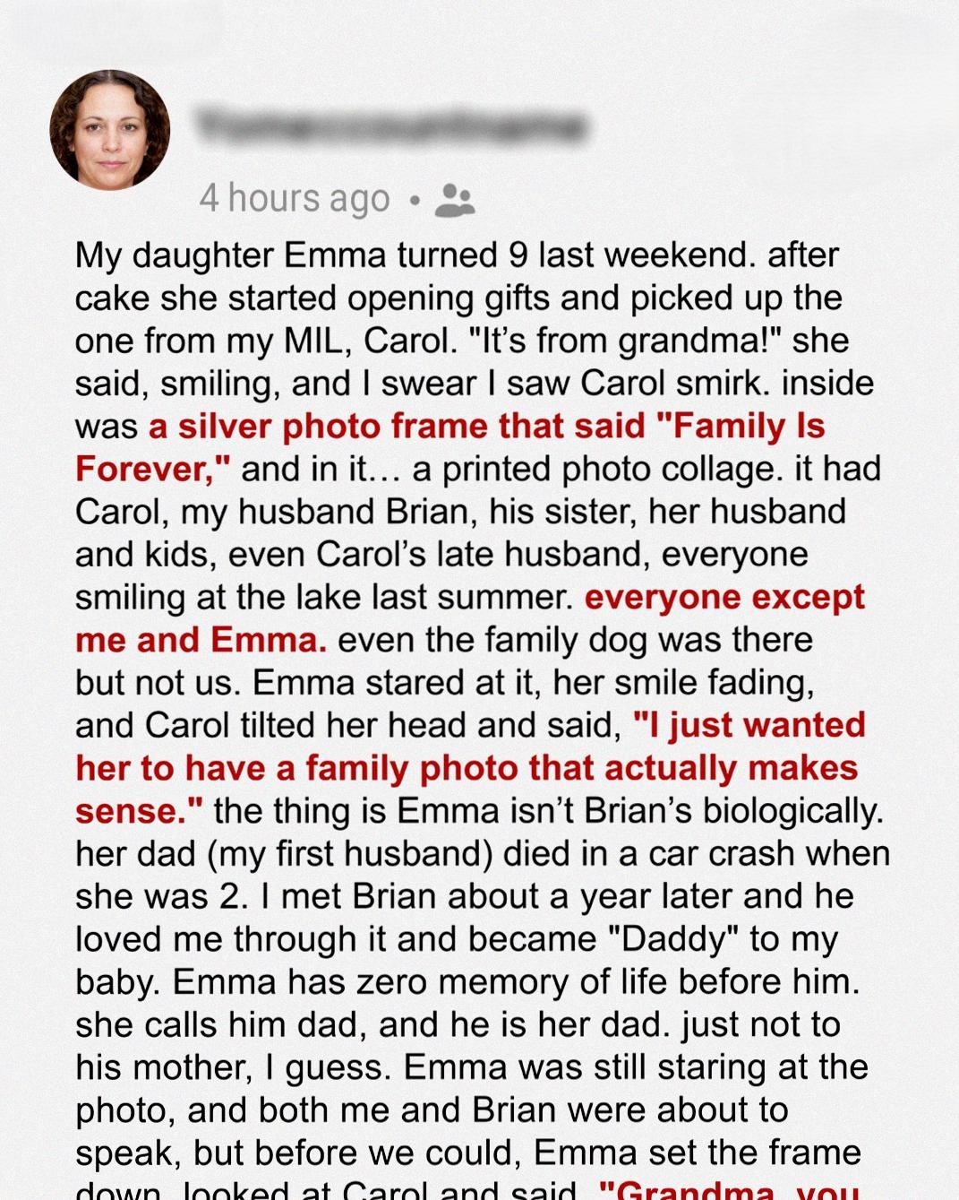My daughter, Emma, turned nine last weekend. We had a lovely party with cake, friends, and family. After cake, Emma excitedly started opening her gifts. She picked up a beautifully wrapped present from my mother-in-law, Carol. “It’s from grandma!” she announced, her face lighting up with a bright smile. I could have sworn I saw Carol smirk just a little bit as Emma said it. Inside the box was a silver photo frame, engraved with the words “Family Is Forever.” And inside the frame was the problem: a professionally printed photo collage. The collage featured Carol, my husband Brian, his sister, her husband and their kids, even Carol’s late husband; everyone was smiling and looked genuinely happy. The photo was taken at the lake last summer, a trip the whole family had taken. But here’s the kicker: everyone was there **except** me and Emma. Even the family dog, a fluffy golden retriever named Max, made the cut, but not us.