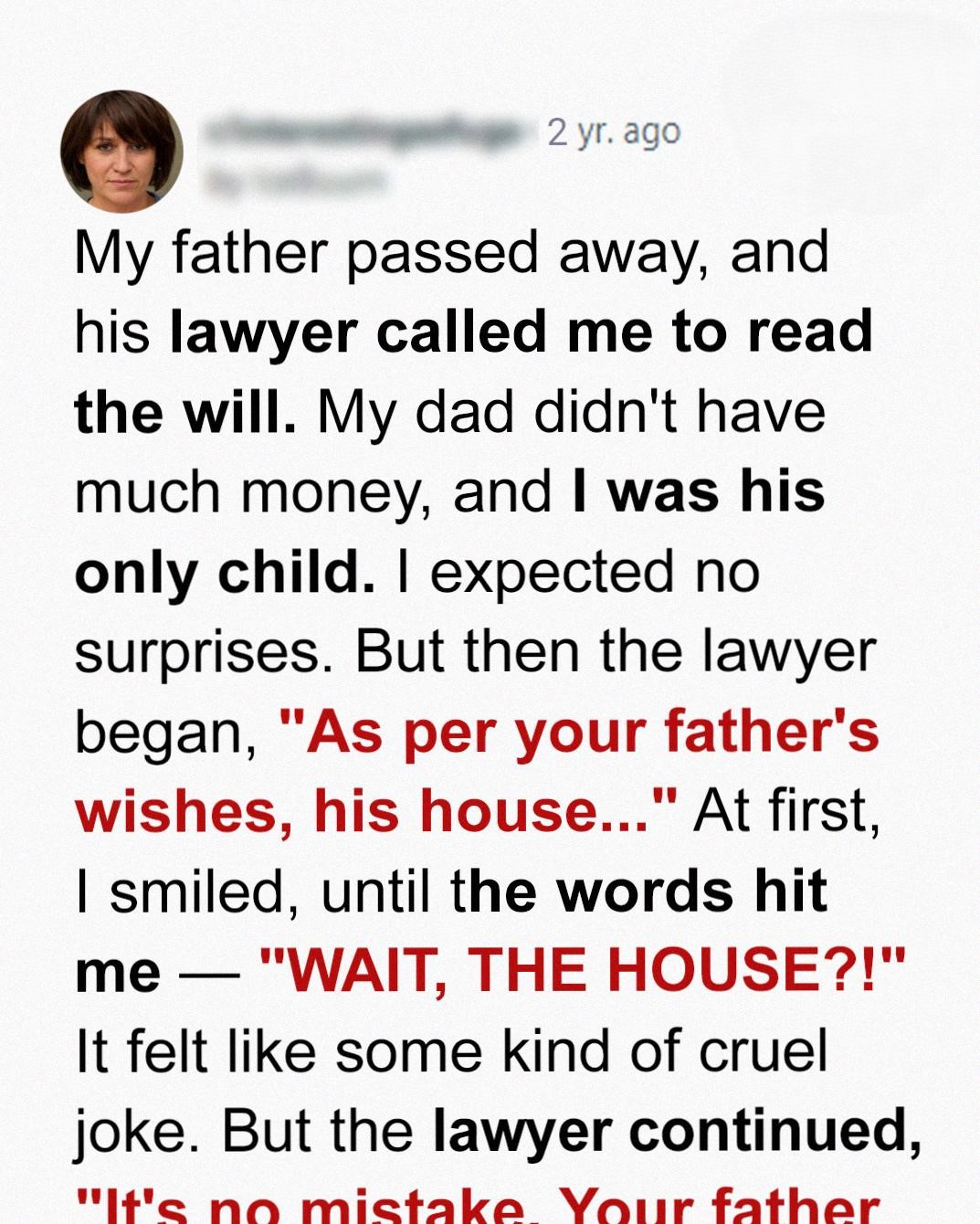 My father’s passing was a heavy blow. We weren’t always close, but he was my dad, my only family. He wasn’t a wealthy man; he worked hard his entire life, but never seemed to get ahead. I assumed there would be little to nothing in the way of inheritance, maybe a few personal belongings, some old furniture. The thought of a large sum of money or valuable property never crossed my mind. I was content with the memories we shared, the lessons he taught me, and the love he gave as I grew up. I made peace with the idea that I would have to navigate life on my own, just as I had always done. I scheduled the meeting with the lawyer, Mr. Abernathy, more out of obligation than expectation. I put on my best suit, the one I usually reserved for funerals and job interviews, and prepared myself for an emotional, but ultimately uneventful, reading of the will. Mr. Abernathy was a stout, balding man with a perpetually grim expression. He cleared his throat, adjusted his glasses, and began to read the document in a monotone voice. The usual legal jargon droned on, listing off insignificant assets – a checking account with a few hundred dollars, a modest life insurance policy. I nodded along, my mind already drifting towards the logistics of settling the estate. Then, he paused, looked up at me with a strange glint in his eye, and uttered the words that would change everything: “As per your father’s wishes, his house…”