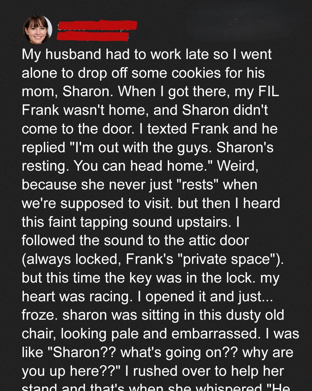 I rushed over to help her stand up, noticing how frail and unsteady she seemed. Her hand trembled as I helped her out of the chair. That’s when she whispered, her voice barely audible, [“He locked me in here”]. My blood ran cold. [“Locked you in here?”], I repeated, my voice trembling with disbelief. “Frank locked you in the attic? Why?” Sharon’s eyes filled with tears. “He… he doesn’t want me to bother him when his friends are over,” she whispered. [“He says I’m too loud and embarrassing”].