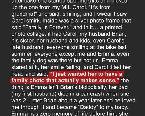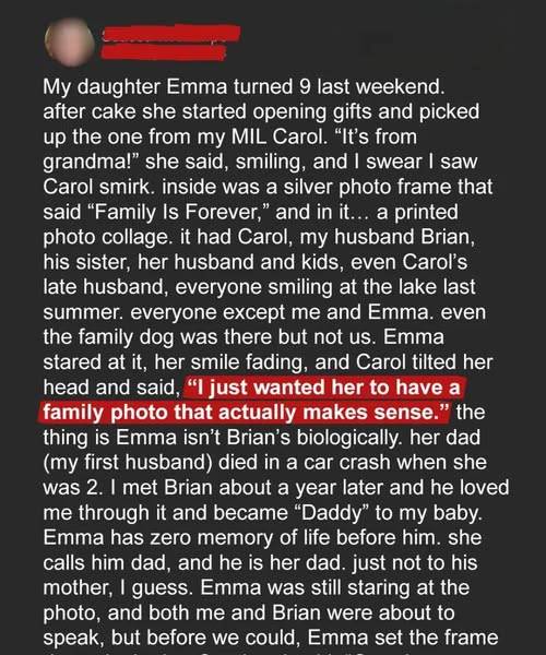 My daughter Emma turned nine last weekend. We had a small party with family, cake, and all the usual birthday fanfare. After cake, she started opening gifts, her excitement building with each present. She picked up a gift from my mother-in-law, Carol. “It’s from Grandma!” she said, smiling, and I swear I saw Carol smirk. I thought nothing of it at the time, just chalked it up to Carol being… Carol. Inside the gift was a silver photo frame that said, “Family Is Forever.” Harmless enough, right? Wrong. Inside the frame was a printed photo collage. It had Carol, my husband Brian, his sister, her husband and kids, even Carol’s late husband, everyone smiling at the lake last summer. It was a group shot from their annual family vacation. Everyone was there… well, almost everyone. Everyone except me and Emma. Even the family dog, Sparky, made the cut, but not us. Emma stared at it, her smile slowly fading as she took in the image. The happy faces of everyone *but* her and her mother. My heart sank. I could feel the blood draining from my face. Brian, to his credit, looked just as shocked and confused as I felt.