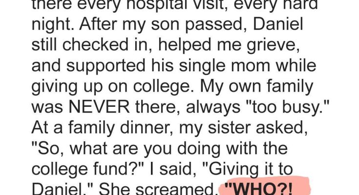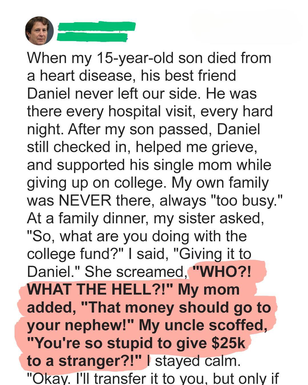 Meanwhile, where was my family? Nowhere to be found. Excuses piled upon excuses: “too busy,” “too far away,” “too difficult.” They sent condolences, of course, but their absence was deafening, a stark contrast to Daniel’s unwavering support. And he was supporting his single mom, so he gave up college to help her. It was during this time that Daniel showed an incredible amount of character. A true friend until the end. My own family always seemed to think of money and appearances.