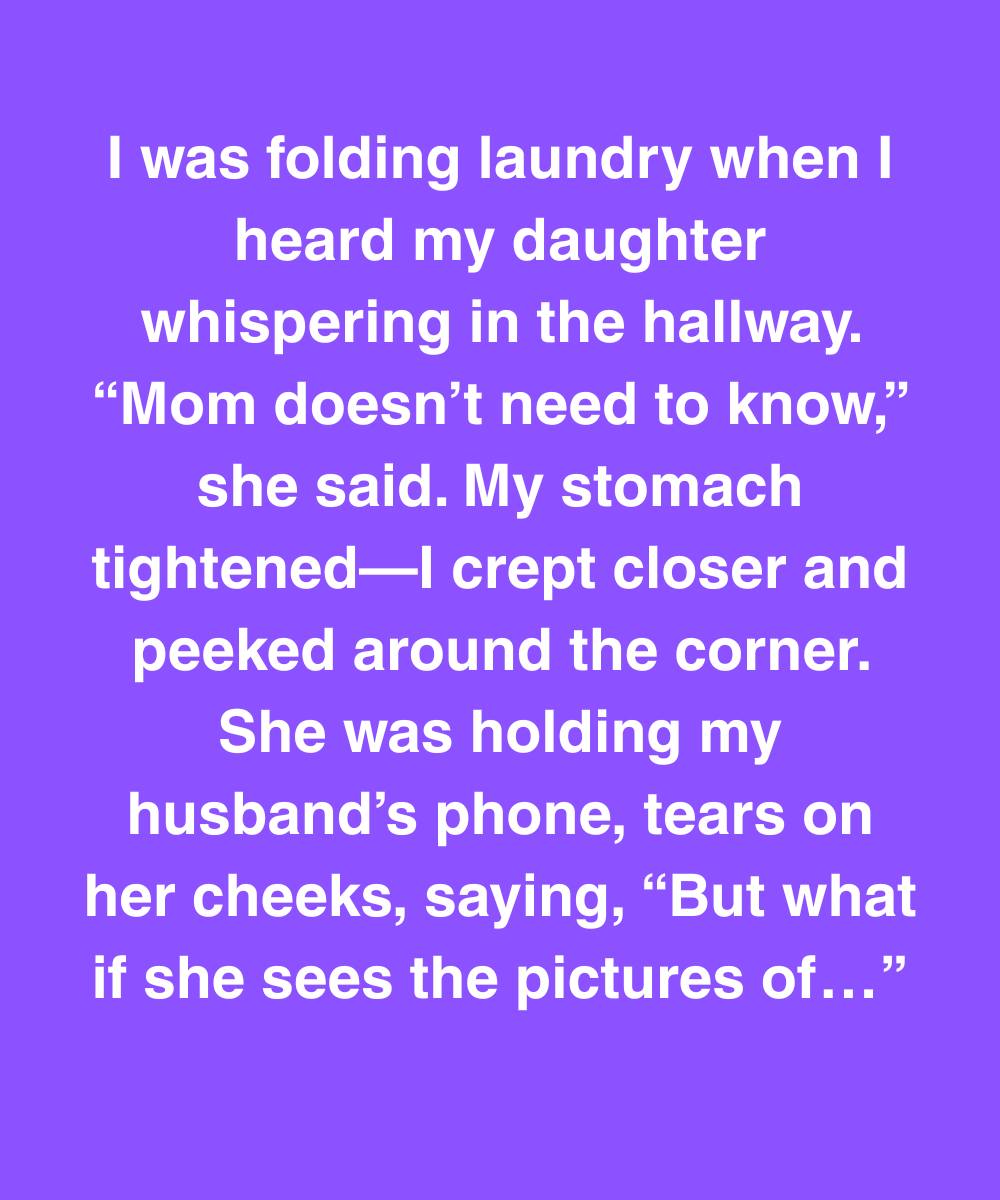 It was a Tuesday, an utterly unremarkable Tuesday. I was tackling the Mount Washmore of laundry that always seems to accumulate in our house, sorting whites from colors, matching socks, the usual mundane tasks. My husband, Mark, was supposedly at work, and my daughter, Lily, was doing her homework upstairs. The house was quiet, filled with the gentle hum of the washing machine and the faint scent of lavender from the dryer sheets. Everything felt… normal. Then I heard it. A faint whisper, coming from the hallway. My daughter’s voice. It was hushed, secretive, laced with an undercurrent of something I couldn’t quite place. Curiosity piqued, I paused my folding and listened more intently. “Mom doesn’t need to know,” she said, her voice barely audible. That was it. That’s the moment my stomach dropped to my toes. A wave of unease washed over me, cold and unsettling. What didn’t I need to know? What was my daughter hiding from me?