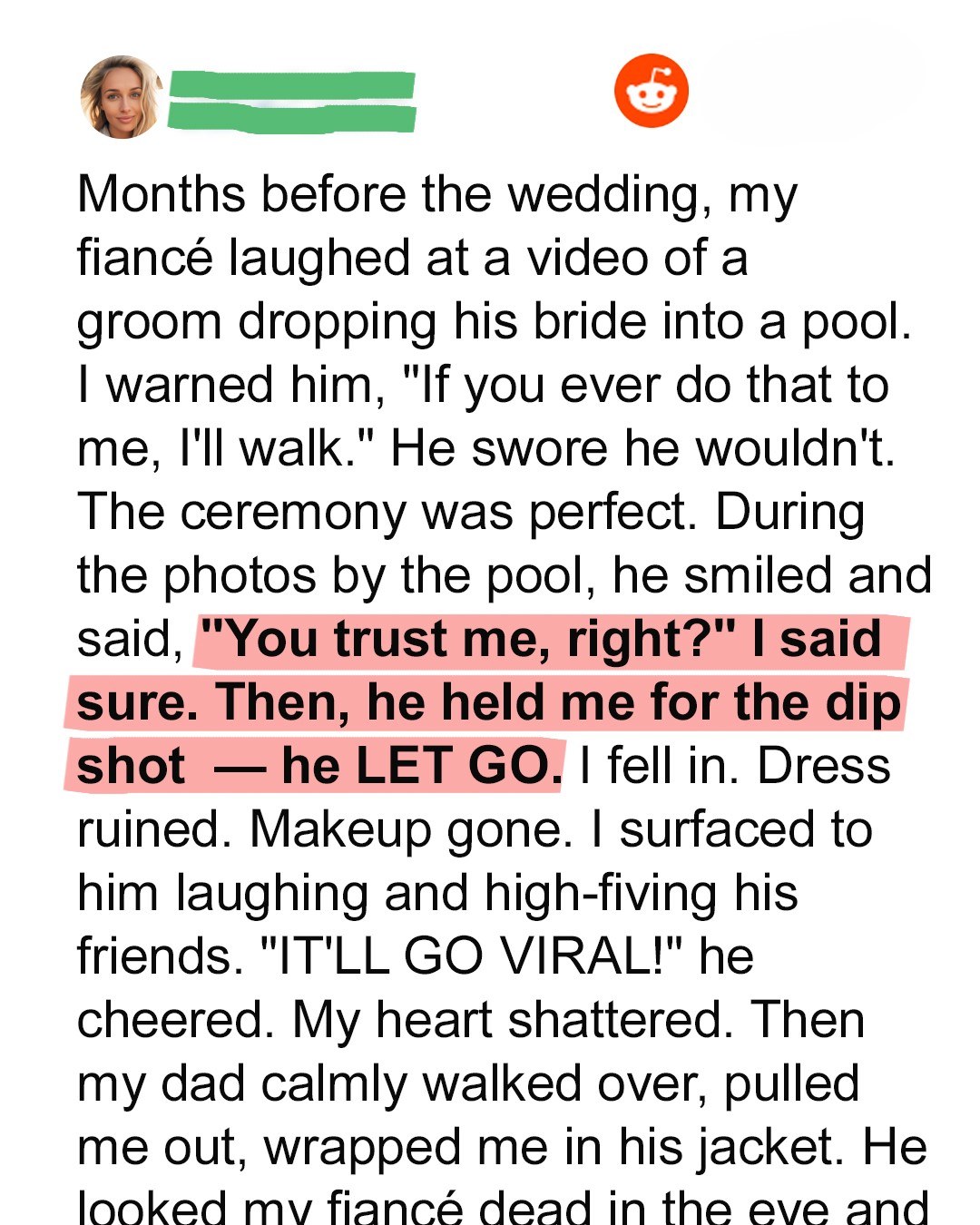 My wedding day was supposed to be the happiest day of my life. I had envisioned every detail, from the perfect dress to the beautiful flowers, and of course, marrying the man I thought was the love of my life. Months leading up to the big day were filled with excitement and anticipation, but there was one seemingly insignificant moment that, in hindsight, served as a major red flag. We were scrolling through social media one evening, and my fiancé came across a video of a groom playfully dropping his bride into a swimming pool during the wedding reception. While some might have found it funny, I was instantly filled with dread. I turned to him and jokingly, but with a hint of seriousness, said, “If you ever do that to me, I’ll walk.” He laughed it off and swore he would never do something like that. I brushed it off at the time, but that comment would unknowingly foreshadow the disastrous events to come.
