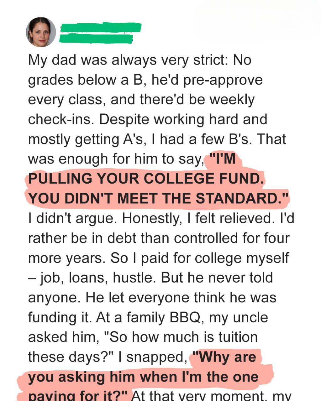 My dad was always… intense. Picture the drill sergeant from every war movie, but replace military discipline with academic expectations. No grade lower than a B was tolerated, every single course I wanted to take had to be pre-approved by him, and every week felt like an interrogation as he meticulously reviewed my progress. It was exhausting, suffocating even. Despite my best efforts, and the fact that I was mostly pulling A’s, a few B’s inevitably slipped through the cracks. And that, apparently, was enough to trigger the nuclear option. I remember the day so clearly. He sat me down at the kitchen table, a grave look on his face that foreshadowed the impending doom. He didn’t mince words. He didn’t offer a chance for redemption. He simply stated, in that unwavering, authoritative voice of his, “I’m pulling your college fund. You didn’t meet the standard.” Part of me wanted to argue, to plead, to explain that I was trying my best, that a couple of B’s didn’t negate all the hard work and A’s. But honestly, a strange sense of relief washed over me. It was as if a massive weight had been lifted off my shoulders. I realized, in that moment, that I would rather be buried under a mountain of student loan debt than endure four more years of his controlling, suffocating influence.