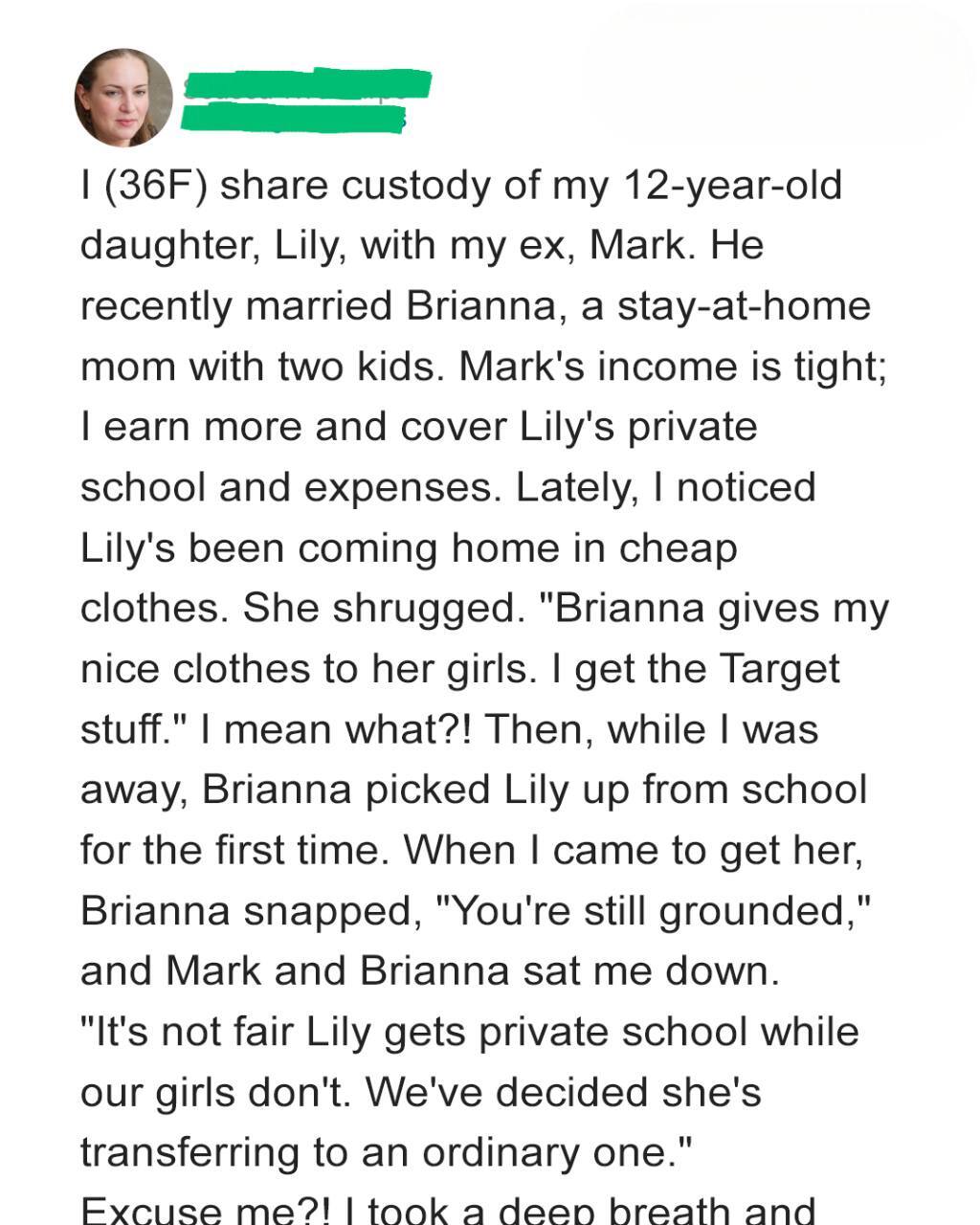 I (36F) share custody of my wonderful 12-year-old daughter, Lily, with my ex-husband, Mark. While our co-parenting relationship has always had its ups and downs, we’ve generally managed to navigate things reasonably well, always prioritizing Lily’s well-being above all else. However, recent events have thrown our carefully constructed equilibrium into complete disarray, leaving me feeling furious, helpless, and utterly betrayed. Mark recently married Brianna, a stay-at-home mom with two daughters of her own, making our blended family a bit more complicated. While I initially welcomed Brianna into our lives, hoping she would bring happiness to Mark and become a positive influence on Lily, I’ve come to realize that she’s harboring a deep-seated resentment towards my daughter, fueled by jealousy and a blatant disregard for Lily’s happiness. My income is significantly higher than Mark’s, allowing me to provide Lily with opportunities he simply can’t afford. I cover all of Lily’s private school tuition and extracurricular activities, ensuring she receives the best possible education and has access to enriching experiences. Mark struggles financially, and I’ve always been understanding and supportive, never begrudging him his limitations. However, it seems Brianna views this disparity as a personal affront, believing her daughters are somehow being deprived because Lily enjoys a more privileged lifestyle. This is where things started to go off the rails.