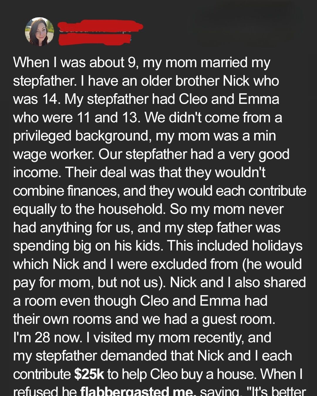 Fast forward to the present, I’m now twenty-eight years old. I recently visited my mom, eager to catch up and spend some quality time with her. However, the visit took a sharp turn when my stepfather cornered Nick and I demanding that we each contribute $25,000 to help Cleo buy a house. The audacity of his request left me speechless. After years of financial disparity, after watching him spoil his daughters while we scraped by, he had the nerve to ask us to bail out his daughter? I was genuinely flabbergasted.