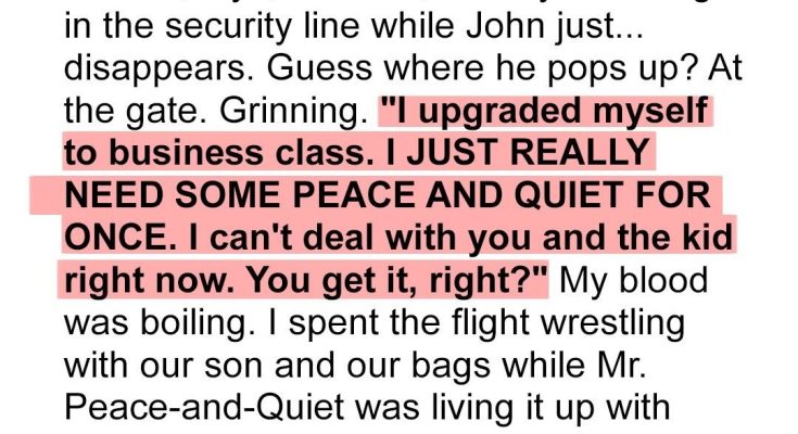 So, there we were, at the airport, ready to endure the joys of flying with a two-year-old. Anyone who has kids knows that flying with toddlers is less about relaxation and more about survival. I was loaded down with what felt like a ton of luggage: diaper bag overflowing with snacks, toys strategically chosen to maintain peace for at least ten minutes, and the dreaded car seat, which always seems to grow extra arms and legs in crowded spaces. John, on the other hand, seemed strangely unburdened. As we inched through the security line, sweating and stressed, John just… disappeared. I assumed he had gone to the restroom, or maybe grabbed a magazine. I certainly didn’t expect what happened next. I finally made it through security, bags somehow still intact, and wrangled our son towards the gate. And there he was, John, standing smugly near the boarding area. A wide, self-satisfied grin plastered across his face. I approached him, relieved to finally have a hand, or at least a supportive comment. Instead, he casually dropped the bomb. He had [ “UPGRADED HIMSELF TO BUSINESS CLASS” ]. His reason? He just “needed some peace and quiet.” He actually said those words. To my face. In an airport. He couldn’t handle the stress of flying with his own child and wife and **needed to escape**. He expected me to understand. I was floored. Beyond furious.
