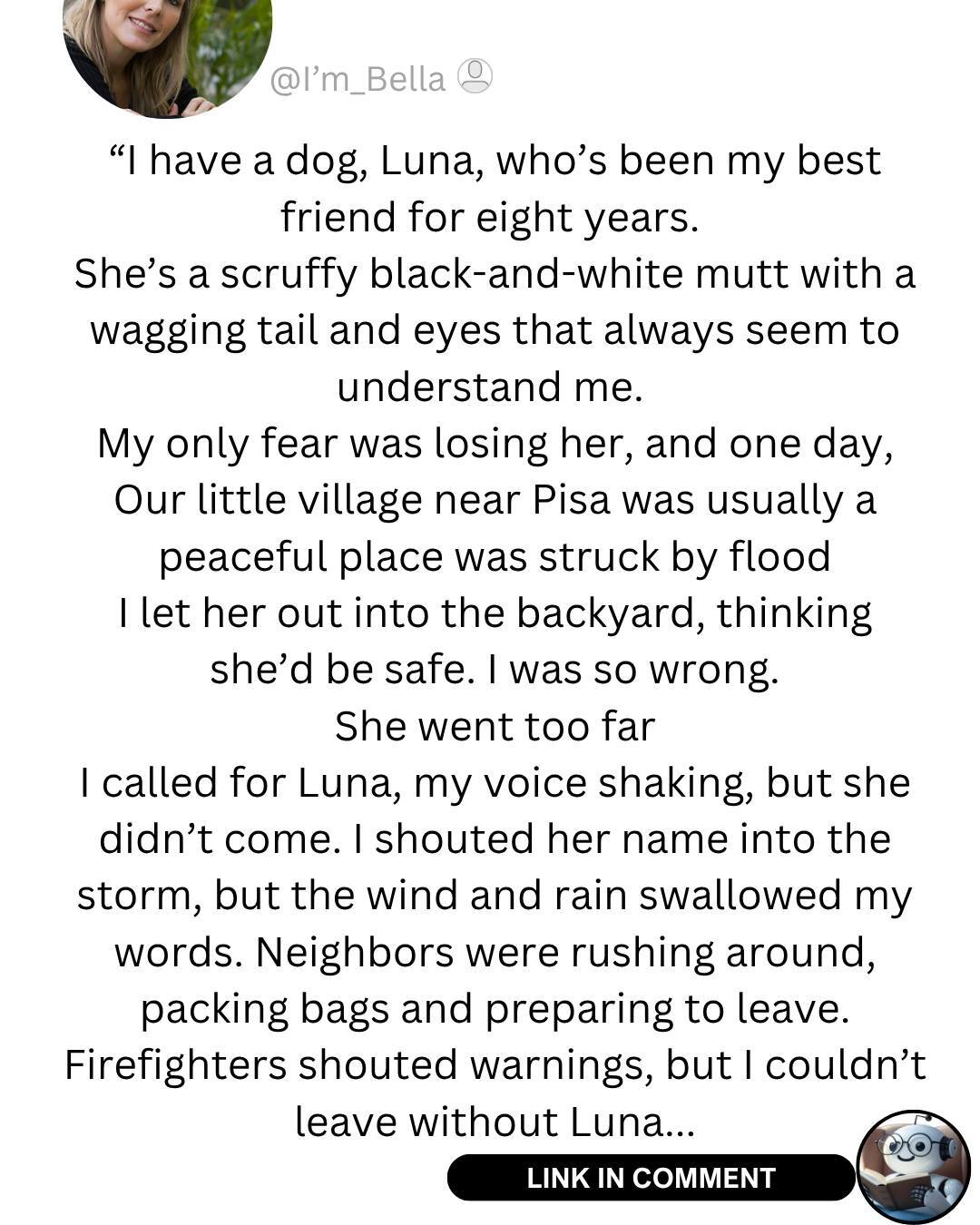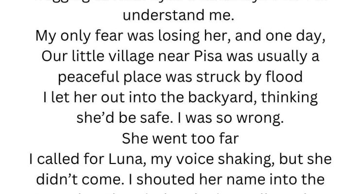 Luna, my eight-year-old scruffy black-and-white mutt, is my best friend. Her tail wags with unbridled joy, and her eyes hold an uncanny understanding. She’s been my constant companion through thick and thin, a furry shadow always ready with a comforting nudge or a playful bark. My biggest fear has always been losing her. We lived in a quiet village nestled near the charming city of Pisa, Italy. Life was simple, peaceful, and filled with the comforting routines that Luna and I shared. Our days consisted of leisurely walks through the vineyards, chasing butterflies in the meadows, and cozy evenings curled up by the fireplace. Little did I know that our idyllic existence was about to be shattered by a force of nature we couldn’t control. One fateful day, the skies opened up, unleashing a torrential downpour that seemed determined to wash away everything in its path. The rain hammered against our windows, the wind howled like a banshee, and the nearby river began to swell at an alarming rate. The usually calm stream was now a raging torrent, threatening to breach its banks and engulf our homes. As the water levels rose, a sense of panic began to grip our village. Neighbors scrambled to protect their belongings, firefighters rushed to evacuate residents, and the air was filled with the sound of sirens and shouts of warning.