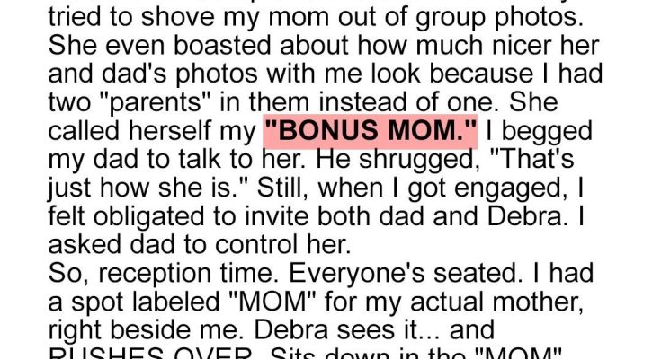 I’m 24F, and my parents divorced when I was in high school. It was a tough time, but we managed. By the time I graduated, my dad was with Debra. From day one, Debra seemed determined to outshine my mom in every way possible. It was subtle at first, but then it became blatant. At my graduation, Debra showed up overdressed and literally tried to shove my mom out of group photos. She even boasted about how much nicer her and Dad’s photos with me looked because I had two “parents” in them instead of one. It was incredibly hurtful, and my mom tried to brush it off, but I could see the pain in her eyes. Debra even had the audacity to call herself my “BONUS MOM,” a title I never asked for, nor wanted. I begged my dad to talk to her, to ask her to be more respectful. But he just shrugged and said, “That’s just how she is.” He never seemed to grasp how much her actions bothered me, how they constantly undermined my relationship with my own mother. Still, when I got engaged to the love of my life, I felt obligated to invite both Dad and Debra. I knew it could be a recipe for disaster, but I hoped that the significance of the day would somehow keep her in check. I specifically asked Dad to control her, to make sure she didn’t pull any of her usual stunts. He promised he would, but I still had a nagging feeling of dread.