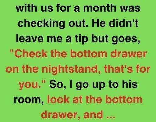 I work at a pretty standard hotel. We get all sorts of guests, from business travelers to families on vacation. You see a lot in the hospitality industry, but nothing could have prepared me for what happened this week. We had this guest, Mr. Henderson, who had been staying with us for about a month. He was a quiet, unassuming man, always polite, kept to himself. He wasn’t demanding or rude, just a regular guest. Honestly, I barely registered him. He’d always just smile and nod when I asked how he was doing; pretty unremarkable all around. He wasn’t a big tipper or anything, but he wasn’t a problem. So when he came to check out, it was just another transaction, another guest moving on. He settled his bill, thanked me for my service (which, again, was pretty standard), and then he said something that completely threw me for a loop. He leaned in and said, “Check the bottom drawer on the nightstand in my room; that’s for you.” And with that, he walked away. No explanation, no further comment. Just that cryptic instruction. I was completely baffled! What could possibly be in that drawer? A complaint letter? Some forgotten toiletries? Maybe a small tip, though that seemed unlikely given his previous behavior. My curiosity was definitely piqued. The checkout rush was beginning, so I couldn’t investigate immediately, but the thought kept nagging at me.