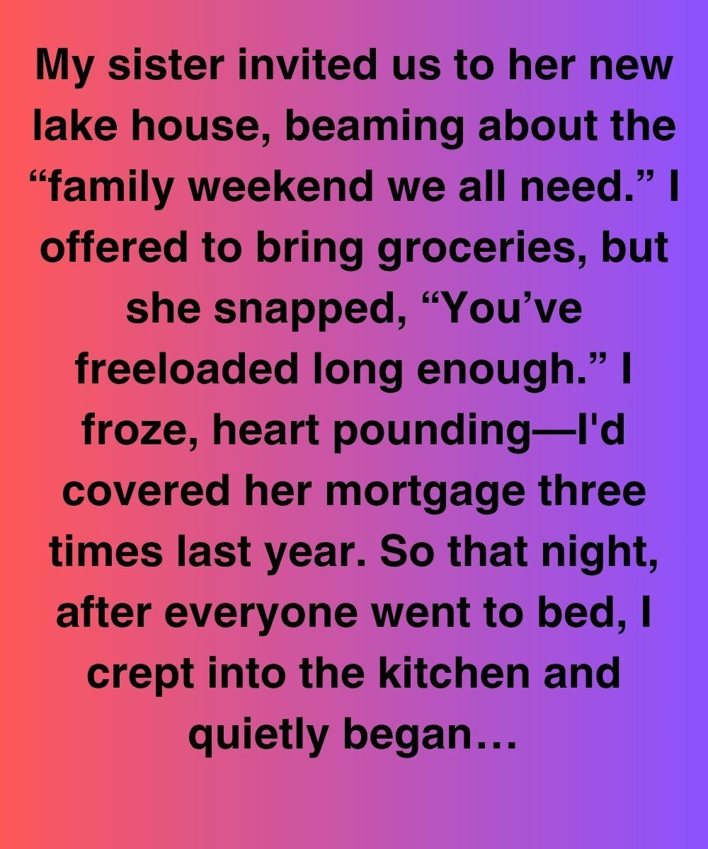 The invitation to my sister Sarah’s new lake house arrived cloaked in a veneer of familial warmth, an email brimming with smiley emojis and promises of a rejuvenating “family weekend.” She gushed about how much we all needed it, a chance to reconnect and unwind amidst the serene beauty of the lake. I, being the ever-helpful (and perhaps slightly naive) sibling, immediately offered to take care of the grocery shopping. I envisioned a fun-filled trip, picturing cozy evenings by the fireplace and sun-drenched afternoons spent swimming in the lake. I even started mentally planning a delicious menu, complete with everyone’s favorite dishes. Little did I know, this gesture of goodwill would be met with a response that would leave me reeling and questioning everything I thought I knew about my relationship with my sister. It was supposed to be a relaxing getaway, a chance to bond and create lasting memories. However, as the weekend approached, an unsettling feeling began to brew within me, a sense of unease that I couldn’t quite shake. I began to question whether I should really be going, and whether or not my offer of help was actually going to be welcomed. Little did I know, the weekend ahead would change our relationship forever.