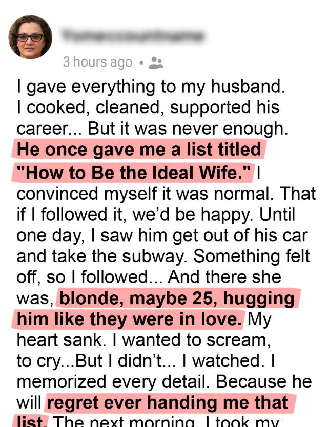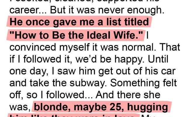 I devoted myself entirely to my husband, pouring every ounce of my energy into nurturing our home and supporting his ambitions. I cooked gourmet meals, maintained an immaculate household, and tirelessly championed his career aspirations, always placing his needs above my own. I genuinely believed that if I created the perfect environment for him, our love would flourish, and we’d achieve a blissful, enduring partnership. Foolishly, I thought I could control the uncontrollable, build a fortress around our love that would keep everything happy inside forever. But it all changed one day when he presented me with a typed document titled “How to Be the Ideal Wife.” The list contained a series of demands and expectations so unrealistic and demeaning that it left me speechless. However, blinded by my desire to please him and salvage our marriage, I convinced myself that it was simply his way of expressing his needs and that if I diligently followed his instructions, we could finally achieve the happiness we both craved. I suppressed my doubts, swallowed my pride, and embarked on a relentless quest to transform myself into the woman he envisioned, meticulously adhering to every item on his ridiculous list. I told myself, again and again, it was all for love. I had to love him enough to look past the oddness. I had to love him enough to endure, to change, to become exactly what he wanted. I truly thought it would be enough. I was, of course, wrong.