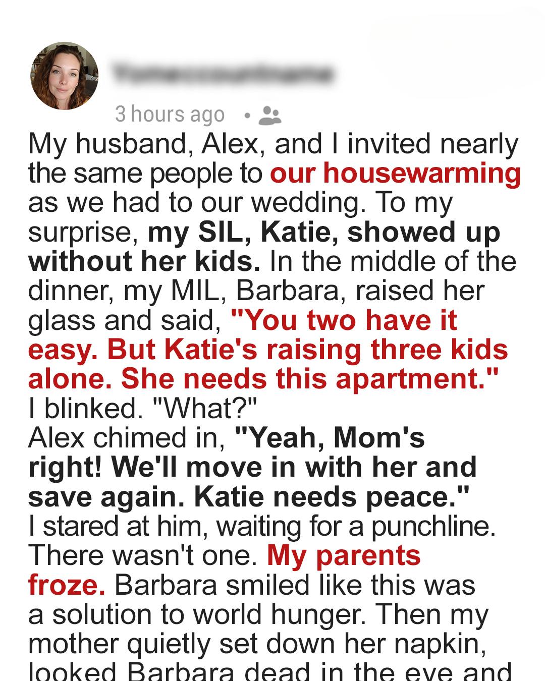 Barbara continued, her gaze fixed on Katie. “But Katie’s raising three kids alone. She needs this apartment.” The room went silent. I blinked, trying to process what I had just heard. “What?” I managed to stammer out, my voice barely above a whisper. My mind raced, trying to make sense of her words. Was this some kind of joke? Was she trying to embarrass us? But the look on her face was serious, and I realized that she was completely sincere. The blood drained from my face as the reality of her request sunk in. She was suggesting that we give up our new apartment, the apartment we had worked so hard for, to my sister-in-law.