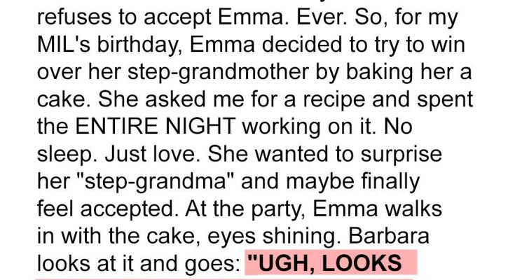 My daughter, Emma, is the light of my life. She’s ten years old, incredibly bright, and possesses a heart that’s far too big for her small frame. Emma constantly tries to win the affection of those around her, especially my current husband’s mother, Barbara. You see, Barbara has never truly accepted Emma as part of our family. It’s a constant source of heartache for my daughter, and frankly, it boils my blood. For Barbara’s birthday, Emma decided she was going to make a grand gesture. She thought, perhaps naively, that if she could bake Barbara a cake, a cake made with love and care, she could finally crack through that icy exterior and earn a place in her step-grandmother’s heart. So, she came to me, her eyes sparkling with hope, and asked for a special recipe. I helped her find one that seemed perfect, and then… the real work began. Emma spent the **ENTIRE NIGHT** working on that cake. While everyone else was sleeping soundly, she was in the kitchen, measuring, mixing, and decorating with the kind of focus and dedication that would put professional bakers to shame. She skipped sleep entirely, fueled only by her desire to make Barbara happy and, more importantly, to finally feel like she belonged. It was a selfless act of love, and I watched her, my heart swelling with both pride and a deep-seated worry that it would all end in disappointment.