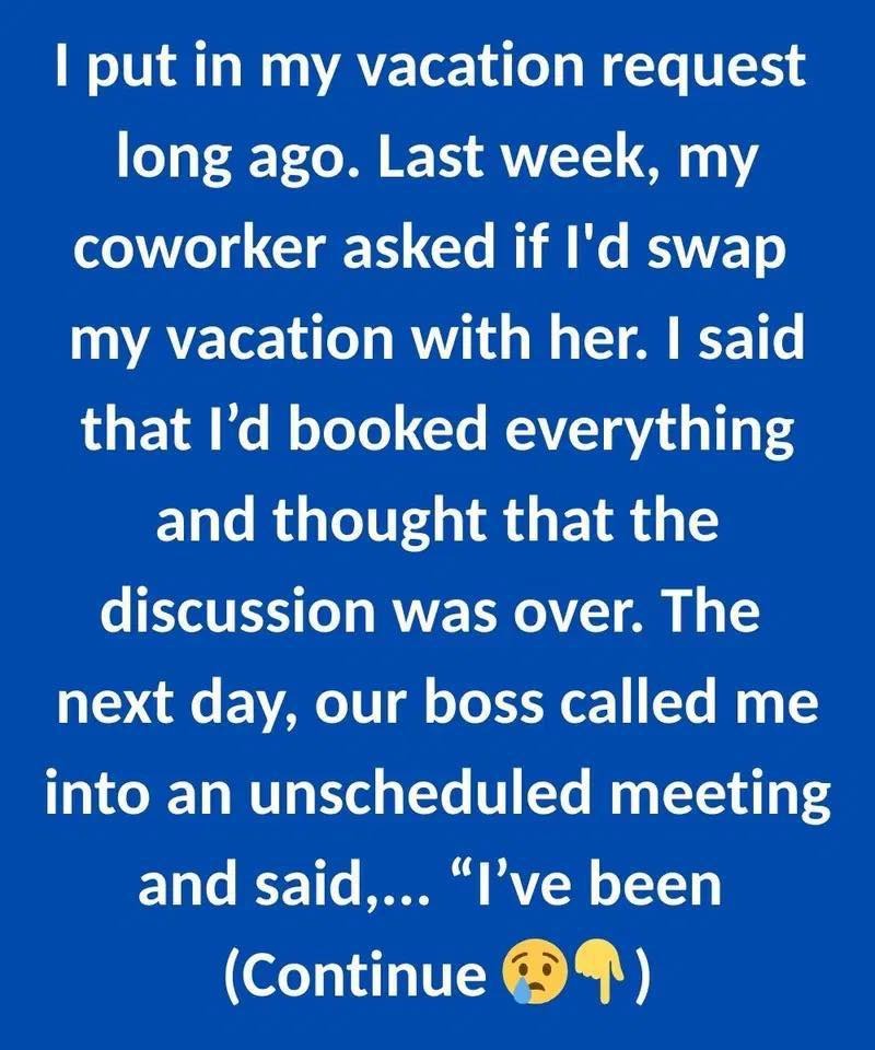 Okay, so, I need to vent. I’ve been working at this company for five years, and I’ve always been a dedicated employee. I consistently meet my deadlines, I’m a team player, and I rarely take time off. So, when I finally decided to plan a much-needed vacation, I thought it would be a non-issue. I submitted my request well in advance, booked my flights and accommodations, and was counting down the days until I could finally escape the daily grind. I envisioned myself lounging on a beach, sipping cocktails, and forgetting about all the stress of work. It was going to be glorious. Then, the dreaded request came. My coworker, let’s call her Sarah, approached me last week with a proposition. She asked if I would be willing to swap my vacation dates with her. I was taken aback, to say the least. I explained to her that I had already made all the arrangements and that it wouldn’t be possible for me to change my plans. I thought that was the end of the discussion, but I was so wrong. So, so wrong. I should have known something was fishy, but I was too focused on my upcoming vacation to notice the red flags. Honestly, I was in vacation mode already, picturing the sand between my toes. I brushed off any lingering concerns, chalking it up to pre-vacation jitters.
