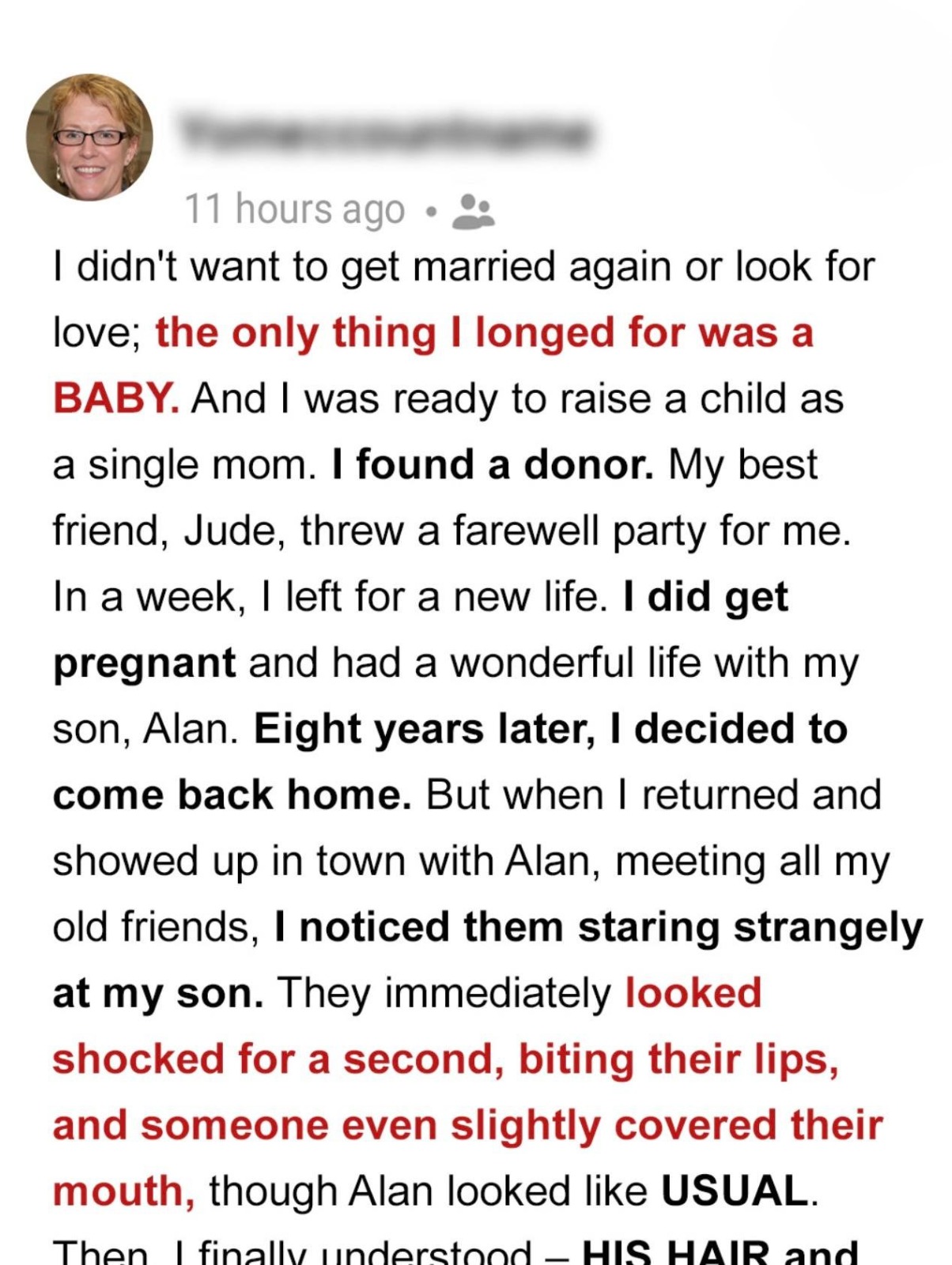 I had absolutely no desire to get married again, nor was I interested in seeking out love. The only thing I longed for, the only thing that truly mattered to me, was the dream of having a baby. I was ready to embrace the challenges and joys of raising a child as a single mother. After careful consideration and research, I made the decision to pursue artificial insemination. I found a suitable donor, someone who met my criteria and aligned with my values. My best friend, Jude, understanding the magnitude of this decision and wanting to support me in every way possible, threw a farewell party for me. It was a bittersweet occasion, filled with both excitement for the future and sadness at leaving behind the familiar. In a week, I packed my bags and left for a new life, a life centered around the dream of motherhood. Fortunately, I did get pregnant and embarked on the incredible journey of raising my son, Alan. Eight years flew by, filled with laughter, love, and the unique challenges of single parenthood. I eventually felt a pull to return home, to reconnect with my roots and share my son with the community I had left behind. The thought of seeing my old friends and introducing them to Alan filled me with excitement. And so, I packed our belongings and made the journey back, eager to start a new chapter in a familiar setting.