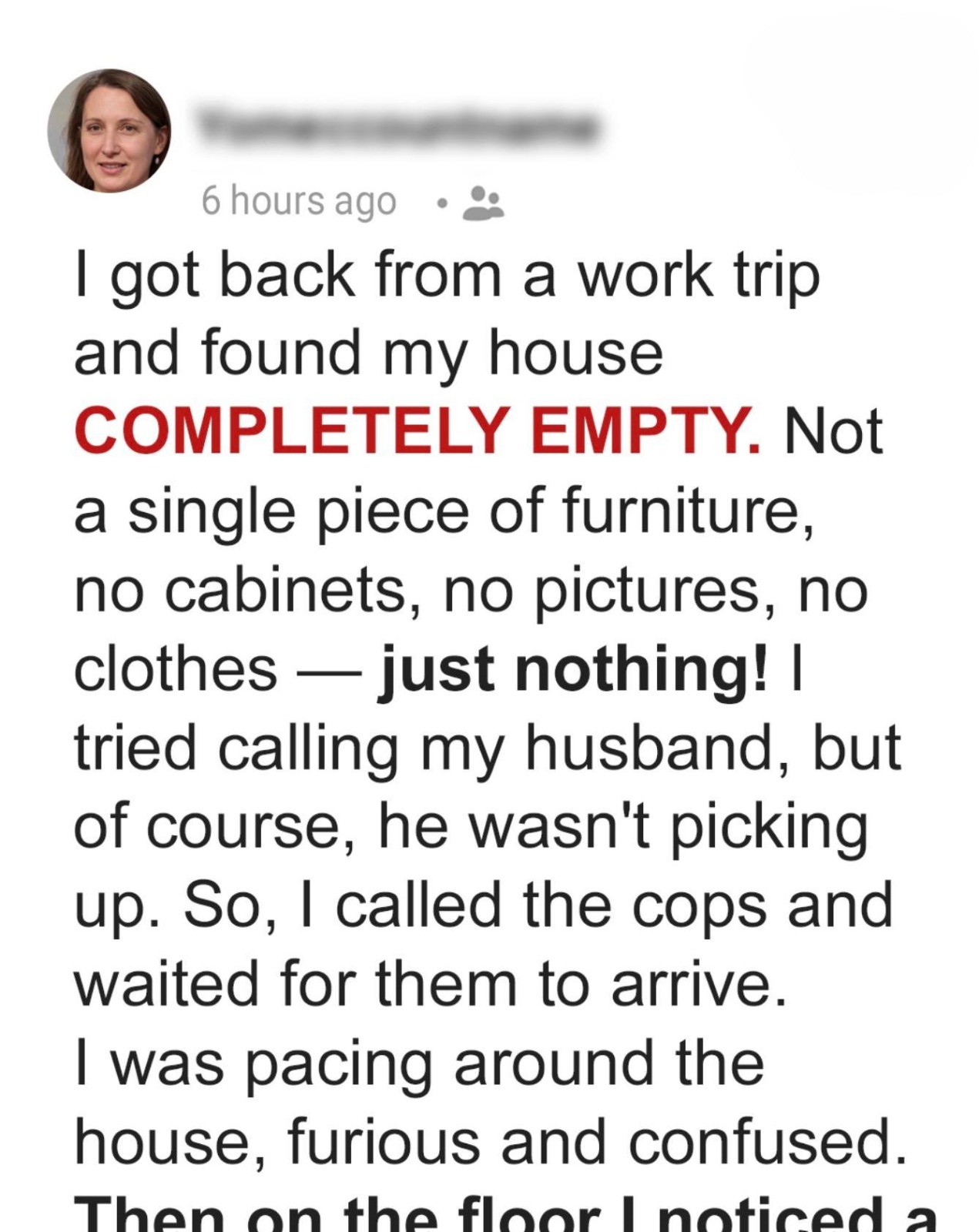 I had been away on a business trip for a week, presenting at a huge conference that could potentially make or break my career. I was exhausted but also incredibly excited to finally be heading home to my husband, Mark, and our cozy little house. I had been looking forward to a quiet evening in, maybe ordering some takeout and catching up on our favorite TV shows. As I pulled into the driveway, everything seemed normal. The house looked the same as always, the lawn was neatly mowed, and the curtains were drawn. I unlocked the front door, stepped inside, and that’s when the **horror** began. My heart skipped a beat. An unsettling silence hung in the air, heavier than anything I had ever experienced. Where was the familiar clutter of everyday life? Where was the comforting aroma of home? [ “EVERYTHING. WAS. GONE.” ] The living room was bare, devoid of furniture, rugs, and even the small decorative items I had painstakingly collected over the years. The kitchen was equally desolate, with empty cabinets and countertops. Not even a coffee maker remained. I ran through the house, a growing sense of dread washing over me with each empty room. The bedrooms were stripped bare, no beds, no clothes in the closets, not even a single picture on the walls. It was as if someone had meticulously erased any sign of our existence, leaving behind only empty, echoing spaces.