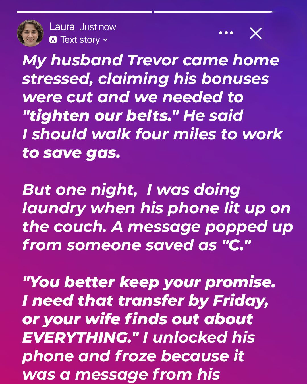 One evening, after a particularly long day at school, I was doing laundry when Trevor’s phone, lying forgotten on the living room couch, lit up with a new message. The screen preview showed a message from a contact saved only as “C.” The message read: “You better keep your promise. I need that transfer by Friday, or your wife finds out about EVERYTHING.” My heart pounded in my chest. Who was “C,” and what “promise” was Trevor making? What “EVERYTHING” was he so desperate to keep from me? My hands trembled as I reached for the phone, a sense of dread washing over me.