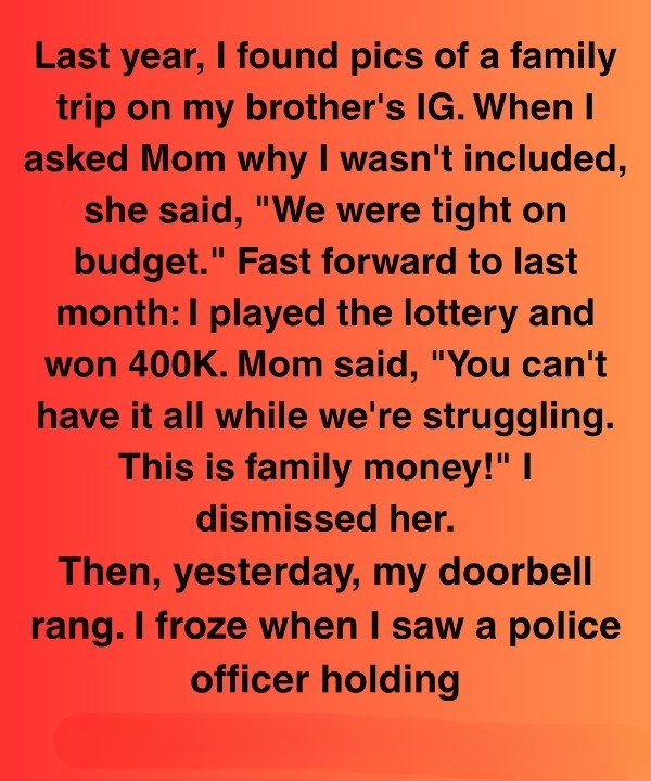 It turns out, my mother had filed a police report claiming that I had stolen family money. She had somehow convinced herself that my lottery winnings were rightfully hers and that I was a thief for keeping them. The officer, thankfully, seemed skeptical of her claims, but he still had to investigate. He asked me a series of questions about the lottery ticket, the winnings, and my relationship with my mother. I explained everything, trying to remain calm and composed despite the sheer absurdity of the situation. After what felt like an eternity, the officer finally said that he would be closing the case. He told me that my mother’s claims were unfounded and that I had every right to keep my winnings. He apologized for the inconvenience and left. I closed the door, shaking my head in disbelief. My own mother had called the police on me over a lottery ticket. The level of betrayal was incomprehensible. The whole thing was a mess, and honestly? I’m re-evaluating everything. Maybe money DOES change people, including the people I thought I knew best.