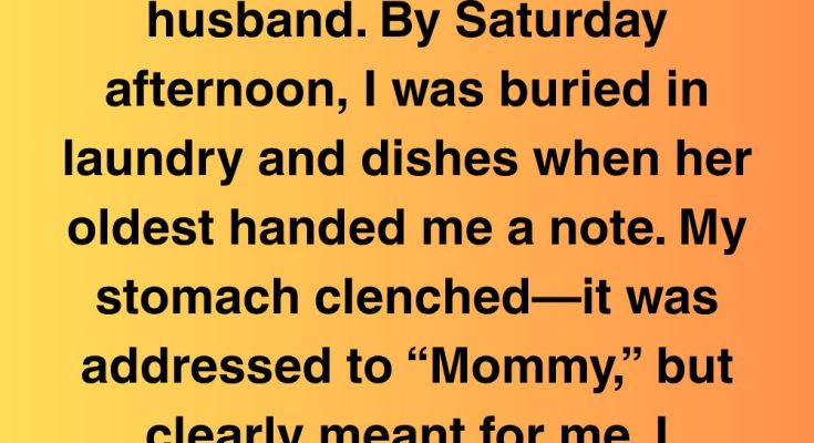 I was **knee-deep in soapy water**, scrubbing a particularly stubborn casserole dish, when Emily approached me with a folded piece of paper. “Aunt [Your Name], I made a note for Mommy,” she said, holding it out to me. My heart did a funny little skip. I knew Sarah wouldn’t be back until Sunday evening, so I assumed it was just a sweet little drawing or message that Emily wanted to give her when she returned. “That’s so sweet, honey,” I said, drying my hands on a dish towel. “I’ll make sure she gets it as soon as she gets home.” Emily hesitated. “But…it’s kind of important,” she said, her voice barely above a whisper. “Can you read it now?” I looked at her, noticing the unusual seriousness in her eyes. Something felt off. I took the note from her and unfolded it. My stomach clenched as I read the words scrawled in childish handwriting.