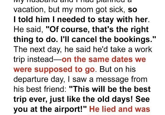 My husband, Mark, and I had been planning this vacation for months. It was supposed to be our escape, a chance to reconnect and relax away from the stresses of daily life. We’d meticulously chosen the resort, a beautiful, secluded spot known for its stunning beaches and luxurious amenities. We spent hours online, drooling over the pictures and daydreaming about the cocktails we’d sip by the pool. The anticipation was palpable, a constant hum of excitement that filled our conversations and made even the mundane tasks of life a little more bearable. We needed this vacation, a breath of fresh air to revitalize our relationship and remind us why we fell in love in the first place. Then, life threw us a curveball. My mom, who lives alone, suddenly fell ill. It wasn’t anything life-threatening, but she needed someone to stay with her, to help with the everyday tasks that had become difficult for her to manage on her own. I immediately knew what I had to do. Family comes first, always. So, I turned to Mark, my heart heavy with disappointment, and explained the situation. I told him I couldn’t go on the vacation, that I needed to stay and take care of my mom. I expected disappointment, maybe even a little frustration. What I got was unwavering support. Mark, being the amazing man I thought I knew, understood completely. He held me close and assured me that my mom was the priority. He even offered to cancel the entire trip himself, saying, “Of course, that’s the right thing to do. I’ll cancel the bookings.”