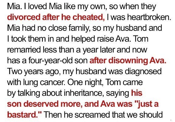 Sixteen years ago, my son, Tom, had a daughter, Ava, with his now ex-wife, Mia. I loved Mia like she was my own daughter, and our family embraced her wholeheartedly. When Tom and Mia divorced after he cheated, I was absolutely heartbroken. Mia didn’t have any close family nearby, so my husband, David, and I took them both in. We helped raise Ava, showering her with the love and support she deserved. Tom, however, remarried less than a year later, seemingly erasing Mia and Ava from his life. He went on to have a four-year-old son with his new wife, further solidifying Ava’s position as the forgotten child. It was a painful situation to watch, but we did everything we could to make Ava feel loved and secure. Two years ago, our world was shaken once again when my husband, David, was diagnosed with lung cancer. It was devastating news, and we all struggled to come to terms with it. During this already difficult time, Tom’s true colors began to show. One night, he came by the house, not to offer support or comfort, but to talk about inheritance. He callously stated that his son deserved a larger share of our estate and that Ava was “just a bastard,” undeserving of anything. His words were like a knife to the heart, revealing a level of cruelty I never thought possible.