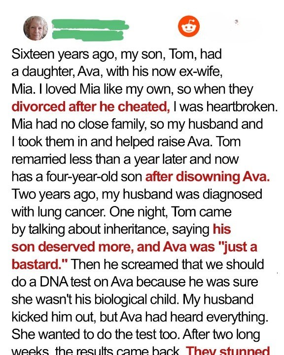 Sixteen years ago, my son, Tom, had a daughter, Ava, with his now ex-wife, Mia. I loved Mia like she was my own daughter, and our family embraced her wholeheartedly. When Tom and Mia divorced after he cheated, I was absolutely heartbroken. Mia didn’t have any close family nearby, so my husband, David, and I took them both in. We helped raise Ava, showering her with the love and support she deserved. Tom, however, remarried less than a year later, seemingly erasing Mia and Ava from his life. He went on to have a four-year-old son with his new wife, further solidifying Ava’s position as the forgotten child. It was a painful situation to watch, but we did everything we could to make Ava feel loved and secure. Two years ago, our world was shaken once again when my husband, David, was diagnosed with lung cancer. It was devastating news, and we all struggled to come to terms with it. During this already difficult time, Tom’s true colors began to show. One night, he came by the house, not to offer support or comfort, but to talk about inheritance. He callously stated that his son deserved a larger share of our estate and that Ava was “just a bastard,” undeserving of anything. His words were like a knife to the heart, revealing a level of cruelty I never thought possible.