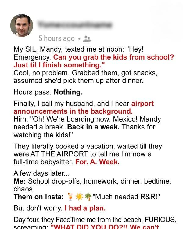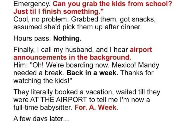 Finally, I decided to call my husband, thinking maybe he would know what was going on. The moment he picked up, I could hear airport announcements in the background. My heart sank. I asked him where he was, and he nonchalantly replied, “Oh! We’re boarding now. Mexico! Mandy needed a break. Back in a week. Thanks for watching the kids!” I was speechless. They had literally booked a vacation and waited until they were AT THE AIRPORT to tell me that I was now a full-time babysitter for an entire week. [ “I WAS BEYOND FURIOUS” ].