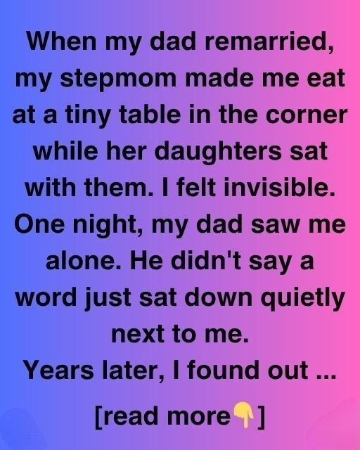 Life with my stepmother was never easy. After my dad remarried, our once cozy home transformed into a battleground of subtle cruelties and blatant favoritism. While her daughters, Brittany and Tiffany, basked in the warmth of her attention and lavish gifts, I found myself relegated to the sidelines, a ghost in my own house. Every dinner became a torturous spectacle, a performance of familial bliss from which I was deliberately excluded. They would all sit around the large, ornate dining table, laughing and sharing stories, while I was banished to a small, rickety table tucked away in a dimly lit corner of the kitchen. It felt like a constant, stinging reminder that I didn’t belong, that I was an unwelcome intruder in their perfect little world. The food tasted like ash in my mouth, the silence amplifying the gnawing loneliness in my heart. I tried to ignore their laughter, their chatter, their seemingly effortless camaraderie, but it was impossible. Every glance, every shared joke, every moment of connection served as a painful reminder of my isolation. I yearned to be included, to be accepted, to be seen as something other than an inconvenience, but my stepmother seemed determined to keep me at arm’s length. She would often make snide remarks about my appearance, my grades, my hobbies, anything she could find to chip away at my self-esteem. My father, usually a pillar of strength and support, seemed oblivious to the injustice, lost in the fog of his new romance.