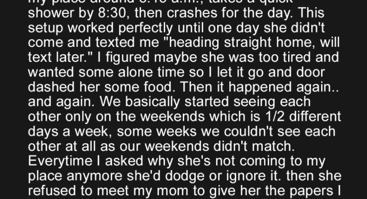 My girlfriend works grueling 12-hour overnight shifts, from 7 p.m. to 7 a.m. After work, she usually comes to my place around 8:15 a.m., takes a quick shower by 8:30, and then crashes for the day. This setup worked perfectly for months, and we both enjoyed the routine. It was a comfortable and predictable arrangement that fit our busy lives. Then, one day, she didn’t come. She texted me, “Heading straight home, will text later.” I figured maybe she was extra tired and wanted some alone time, so I let it go and DoorDashed her some food. I thought it was a one-off thing and didn’t pay much mind to it. Maybe she was just exhausted and needed the comfort of her own space. But then it happened again… and again. We basically started seeing each other only on the weekends, which is only 1/2 different days a week. Some weeks, we couldn’t see each other at all, as our weekends didn’t match. I was starting to feel neglected and confused. The distance between us was growing, and I couldn’t understand why.