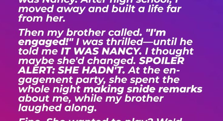 It all started in high school. I was that kid, you know, the one who always seemed to be a target. And Nancy? Nancy was the queen bee, the apex predator of the social jungle. She had this way of zeroing in on your insecurities, twisting the knife with a smile, making sure you felt utterly, completely worthless. Every day was a gauntlet of whispered insults, public humiliations, and just a general feeling of dread. I tried to ignore it, to rise above it, but it’s hard when someone is constantly chipping away at your self-esteem. High school felt like an eternity, a never-ending cycle of torment. I couldn’t wait to graduate, to escape, to build a life far, far away from Nancy and her poisonous influence. And I did. I moved across the country, went to college, got a good job, surrounded myself with supportive friends. I built a life I was proud of, a life where I felt safe and happy. I almost forgot about Nancy, about the years of bullying and the constant anxiety. Almost. Then, the phone rang. It was my brother, his voice bubbling with excitement. “I’m engaged!” he announced. I was thrilled for him, genuinely happy that he’d found someone to share his life with. “That’s amazing! Who’s the lucky girl?” I asked, picturing some kind, sweet, wonderful woman who would make him even happier than he already was.