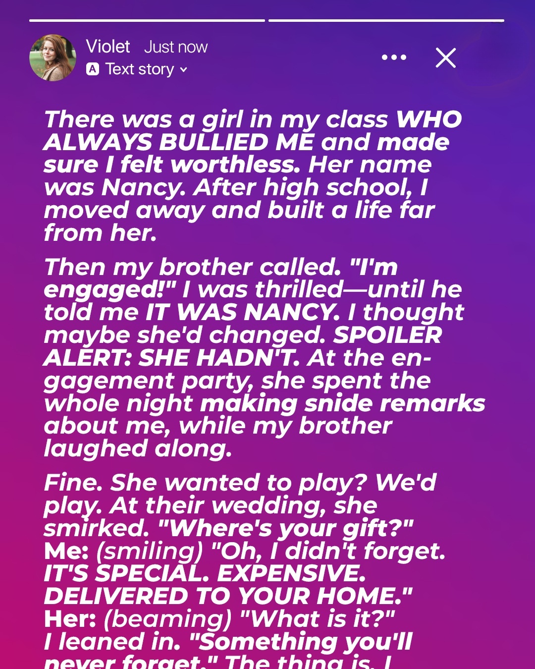 Her eyes lit up. “What is it?” she asked, practically drooling with anticipation. I leaned in close, my voice barely a whisper. “Something you’ll never forget.” The “gift” was a series of billboards strategically placed all around town, each one displaying screenshots of Nancy’s most vile social media posts from high school, the ones where she had relentlessly mocked and humiliated me. Each billboard ended with the tagline: “Karma’s a B*tch, Nancy. Enjoy your wedding day!” The look on her face when she found out? Priceless. My brother was furious, of course, but honestly? It was worth it. Some wounds just never heal, and some people just never learn. But sometimes, karma steps in to give them a little nudge in the right direction.