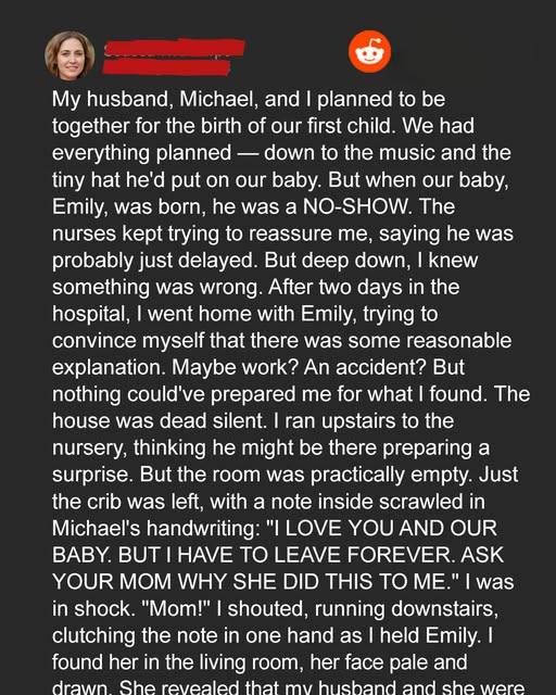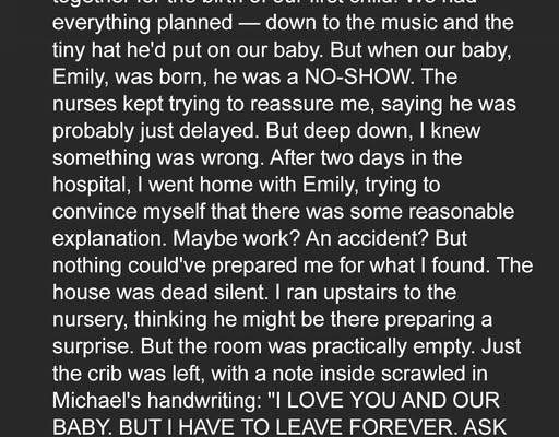 After two days in the hospital, I went home with Emily, trying to convince myself that there was some reasonable explanation. Maybe work? An accident? But nothing could’ve prepared me for what I found. The house was dead silent. I ran upstairs to the nursery, thinking he might be there preparing a surprise. But the room was practically empty. Just the crib was left, with a note inside scrawled in Michael’s handwriting: “I LOVE YOU AND OUR BABY. BUT I HAVE TO LEAVE FOREVER. ASK YOUR MOM WHY SHE DID THIS TO ME.”