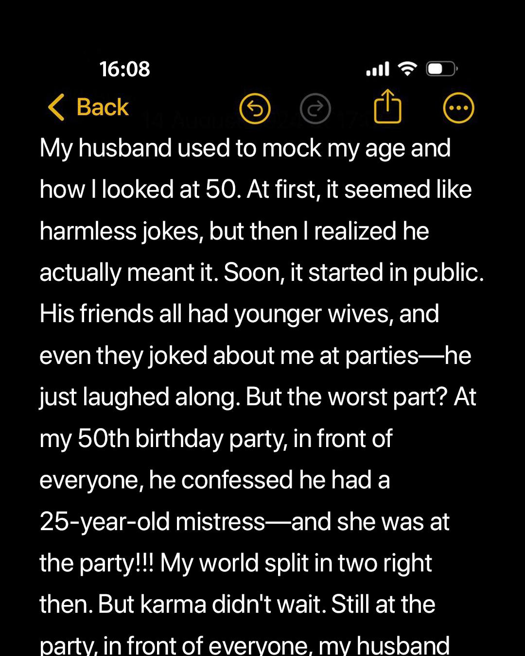 My 50th birthday was supposed to be a celebration of life, love, and the journey I’d travelled so far. I had envisioned a night filled with laughter, warm embraces from family and friends, and maybe even a few embarrassing stories shared from my childhood. What I did *not* anticipate was having my entire world shattered into a million pieces, the kind of earth-shattering experience that you read about in dramatic novels or see portrayed in melodramatic movies. It all began subtly, insidiously even. My husband, Mark, had always been somewhat preoccupied with appearances, but as I approached the big 5-0, his comments became more pointed, more frequent, and decidedly more cruel. At first, I brushed them off as harmless jokes, the kind that couples exchange playfully. He would tease me about my **’senior moments’** or remark on the appearance of a few more wrinkles around my eyes. I would laugh it off, attributing it to his quirky sense of humour and the general anxieties that come with aging.