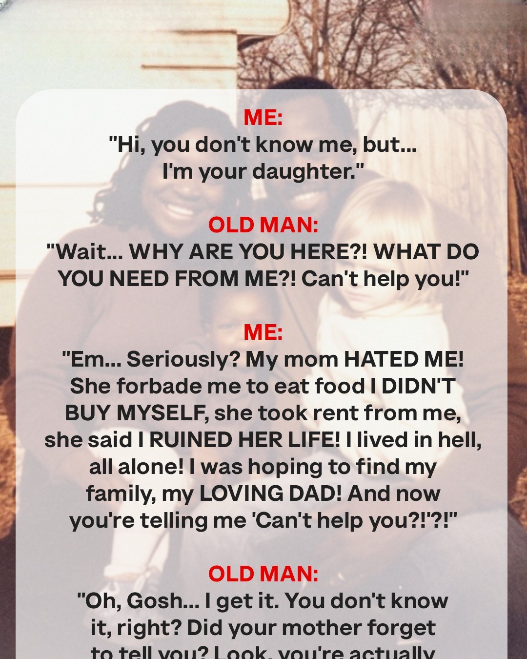 “Em… Seriously? My mom HATED ME! She forbade me to eat food I DIDN’T BUY MYSELF, she took rent from me, she said I RUINED HER LIFE! I lived in hell, all alone! I was hoping to find my family, my LOVING DAD! And now you’re telling me ‘Can’t help you?!’?!” I retorted, my voice shaking with emotion. The floodgates had opened, and years of pent-up frustration and anger poured out of me in a torrent of words. I couldn’t hold back any longer; I had to make him understand the pain I had endured, the loneliness that had consumed me. I wanted him to see the damage my mother had inflicted, the emotional scars that ran deep. I had always longed for a father figure, someone to protect me, to guide me, to love me unconditionally. I thought that finding him would finally fill the void in my heart. Instead, he acted like I was a burden.