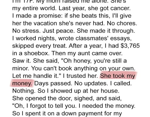 I’m a 17-year-old female, and my mom is my entire world. She raised me alone, and last year, she was diagnosed with cancer. It was the scariest time of my life. I remember sitting by her bedside in the hospital, holding her hand and just praying for a miracle. I made her a promise. I swore to her that if she beat this horrible disease, I would give her the vacation she’s always dreamed of – a chance to escape all the stress and chores, just pure peace and relaxation. Thankfully, against all odds, my mom pulled through. She is the strongest person I know. I was ecstatic, relieved, and more determined than ever to keep my promise. So, I started working nights, writing essays for my classmates, and skipping every single treat I wanted. Every penny I earned went straight into a shoebox under my bed. It was tough, but the thought of my mom finally getting the break she deserved kept me going.