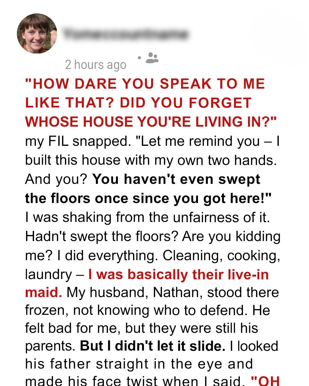 My FIL’s face turned beet red. He was clearly not expecting me to stand up to him. My husband was completely silent, his eyes wide with shock. The tension in the room was so thick you could cut it with a knife. My MIL started to say something but paused because she was also in a state of shock.