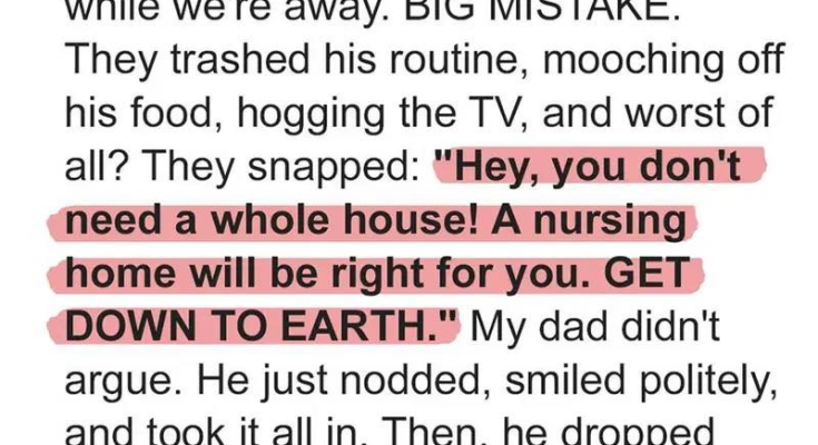 It turns out, my dad had been planning this for weeks. He knew they were eager to get rid of him, and he used their own words against them. Now, they are stuck taking care of him, 24/7. They completely renovated their house with his money. And as for my dad? He is living his best life, enjoying the peace of mind that comes with knowing he is safe and cared for… and that his in-laws are getting exactly what they deserve.