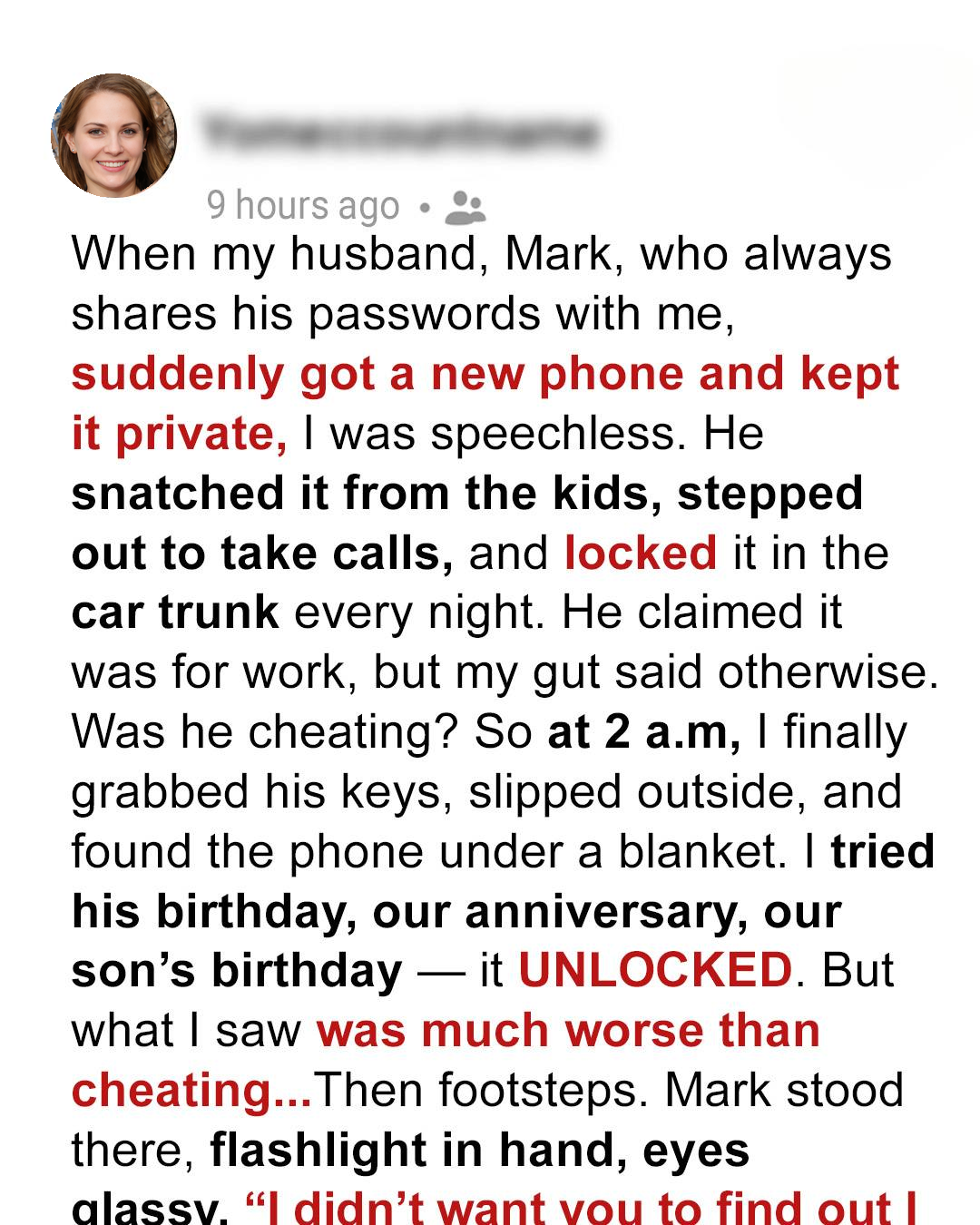My husband, Mark, and I have always prided ourselves on our open and honest relationship. We shared everything – our hopes, our dreams, even our passwords. It was a symbol of our trust, a testament to the unbreakable bond we shared. Or so I thought. Recently, Mark got a new phone. He claimed it was necessary for work, something about enhanced security protocols and needing a dedicated device for client communications. I didn’t think much of it at first. Work is work, and I trusted him implicitly. However, things started to feel off. He became incredibly secretive about the phone. He’d snatch it away from the kids if they got too close, step outside to take calls, and, most alarmingly, lock it in the trunk of his car every night. When I asked about it, he’d brush it off, saying it was just work stuff, nothing I needed to worry about. But my intuition screamed otherwise. I couldn’t shake the feeling that something was terribly wrong. Was he hiding something? Was he seeing someone else?