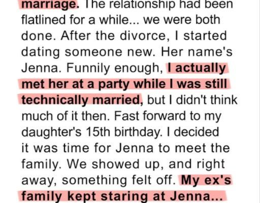 I’m 49 years old and recently divorced after a 20-year marriage that had long lost its spark. My ex-wife, Sarah, and I had simply grown apart, and the decision to separate was mutual, if not a little overdue. The post-divorce dating scene was daunting, to say the least, but I eventually met someone who caught my eye. Her name is Jenna, and she’s vibrant, intelligent, and genuinely fun to be around. Funnily enough, I actually met her at a party while I was still technically married, but at the time I barely noticed her and certainly didn’t think anything of it. Fast forward a few months, and I’m feeling serious enough about Jenna that I decide it’s time for her to meet my family. My daughter, Emily, was turning 15, and I thought her birthday party would be the perfect opportunity. I told Sarah that I would be bringing a date, trying to keep things as amicable as possible. We showed up at the party, and almost immediately, I felt a strange undercurrent in the room. It was subtle, but noticeable. My ex-wife’s family kept staring at Jenna, not with the typical jealousy or judgment I might have expected, but with an expression that was much closer to stunned disbelief. They looked as though they’d seen a ghost. I tried to brush it off, assuming they were just surprised to see me with someone new so soon after the divorce.