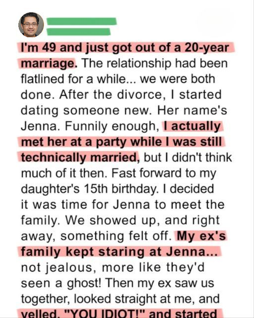 I’m 49 years old and recently divorced after a 20-year marriage that had long lost its spark. My ex-wife, Sarah, and I had simply grown apart, and the decision to separate was mutual, if not a little overdue. The post-divorce dating scene was daunting, to say the least, but I eventually met someone who caught my eye. Her name is Jenna, and she’s vibrant, intelligent, and genuinely fun to be around. Funnily enough, I actually met her at a party while I was still technically married, but at the time I barely noticed her and certainly didn’t think anything of it. Fast forward a few months, and I’m feeling serious enough about Jenna that I decide it’s time for her to meet my family. My daughter, Emily, was turning 15, and I thought her birthday party would be the perfect opportunity. I told Sarah that I would be bringing a date, trying to keep things as amicable as possible. We showed up at the party, and almost immediately, I felt a strange undercurrent in the room. It was subtle, but noticeable. My ex-wife’s family kept staring at Jenna, not with the typical jealousy or judgment I might have expected, but with an expression that was much closer to stunned disbelief. They looked as though they’d seen a ghost. I tried to brush it off, assuming they were just surprised to see me with someone new so soon after the divorce.