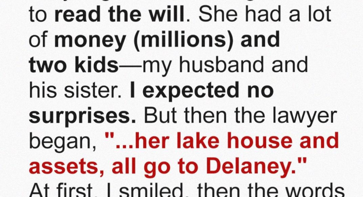 And then came the twist, the moment that flipped my world upside down. The lawyer continued, “And to Delaney…” He paused again, and my head perked up. Delaney? That’s me! I was confused. Had she accidentally included me? The lawyer continued, “…I bequeath my lake house, located on the pristine shores of Lake Serenity, along with all associated assets, including the surrounding land, boats, and equipment.” My jaw dropped. A lake house? This had to be a mistake. My mother-in-law had always been fond of me, but I never imagined she would leave me something so valuable. [“The lake house was LEGENDARY!”]. We had visited it a few times, and it was a stunning property, a true oasis of tranquility. The lawyer wasn’t finished. He added, in a tone that suggested this was an important detail, “This bequest is contingent upon one condition…” My heart pounded in my chest. A condition? What condition could possibly be attached to such an incredible gift?