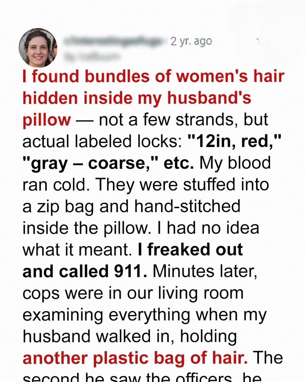 It was just a normal Tuesday. I decided to do some laundry, a task I usually put off for as long as humanly possible. Our bedroom was a disaster, clothes strewn everywhere, a testament to our chaotic lives. As I gathered the dirty linens, I noticed my husband’s pillow looked particularly lumpy and misshapen. It had definitely seen better days. I figured it was time for a good cleaning, maybe even a replacement. But something told me to check it first, an odd premonition that prickled at the back of my neck. I unzipped the pillowcase, expecting to find a stained and worn-out pillow. What I actually found sent shivers down my spine. I carefully sliced open the seam, and there it was: a tightly sealed zip-lock bag. My heart pounded in my chest as I pulled it out, my hands trembling with a mixture of fear and morbid curiosity. Inside, neatly arranged and labeled, were bundles of **WOMEN’S HAIR**. Not just a few strands, but thick, luscious locks of varying colors and textures. “12in, red,” one label read. “Gray – coarse,” another declared. My mind raced, trying to make sense of what I was seeing. Was this some kind of macabre collection? A twisted joke? I felt a wave of nausea wash over me.