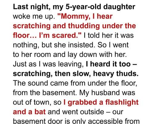 Last night started like any other, filled with the usual bedtime routines and sweet dreams for my five-year-old daughter, Lily. We read her favorite story, tucked her into bed, and I kissed her goodnight, heading back to the living room to unwind after a long day. Everything was peaceful for maybe an hour, then suddenly, Lily came running into the living room, her eyes wide with fear. “Mommy,” she whispered, “I hear scratching and thudding under the floor… I’m scared.” Initially, I brushed it off, attributing it to an overactive imagination or perhaps the settling of the old house. I told her it was probably nothing, just the wind or maybe some critters outside. But she insisted, her little voice trembling with genuine fear, and tugged on my hand, begging me to come back to her room. Relenting, I went back to her room and lay down with her, hoping to reassure her that everything was alright. We listened together for a few minutes, but the house was silent except for the gentle hum of the refrigerator. Just as I was about to get up and leave, thinking she had finally drifted back to sleep, **I heard it too** – a distinct scratching sound, followed by slow, heavy thuds. The sound was unmistakable and seemed to be coming from directly under the floor, from the basement. A chill ran down my spine as reality set in: something was definitely down there, and it wasn’t the wind.