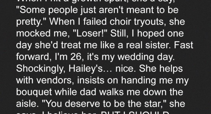 Fast forward to my adult years. I’m 26, and finally, it’s my wedding day. After years of enduring Hailey’s behavior, I was surprised – shocked, even – to see her acting… nice. She helped coordinate with vendors, offering helpful suggestions and actually seeming genuinely enthusiastic about my happiness. She even insisted on handing me my bouquet just before my dad walked me down the aisle, whispering, “You deserve to be the star today.” Honestly, I almost believed her. Almost. It was a stark contrast to the years of hostility, and for a brief moment, I allowed myself to believe that maybe, just maybe, she had finally grown up and put our past behind us. Maybe she had finally accepted me as part of the family. I let my guard down, a mistake I would soon regret.